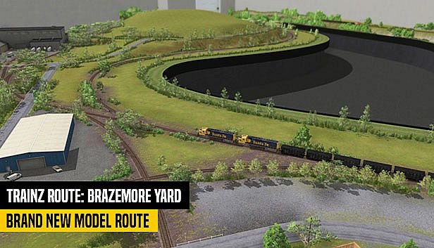 Explore the Brazemore Yard in this Trainz simulation, where detailed track work winds through lush rolling hills. Two main yards connect via a central tunnel or a figure-8 loop, offering varied paths for your journeys. Drive trains along these routes for an authentic model railroading feel.