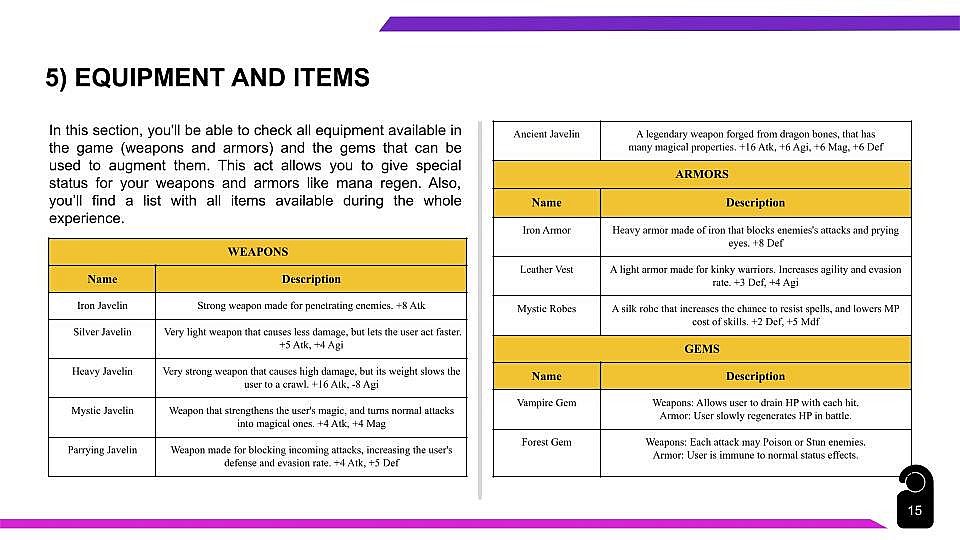 5) Equipment and Items (A list with more than 60 pieces of equipment and items available in the game and their status/effects. Also, crafting system detailed.);