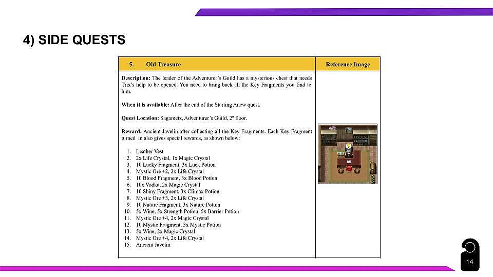 4) Side Quests (Descriptions, when it's available, rewards and tips);