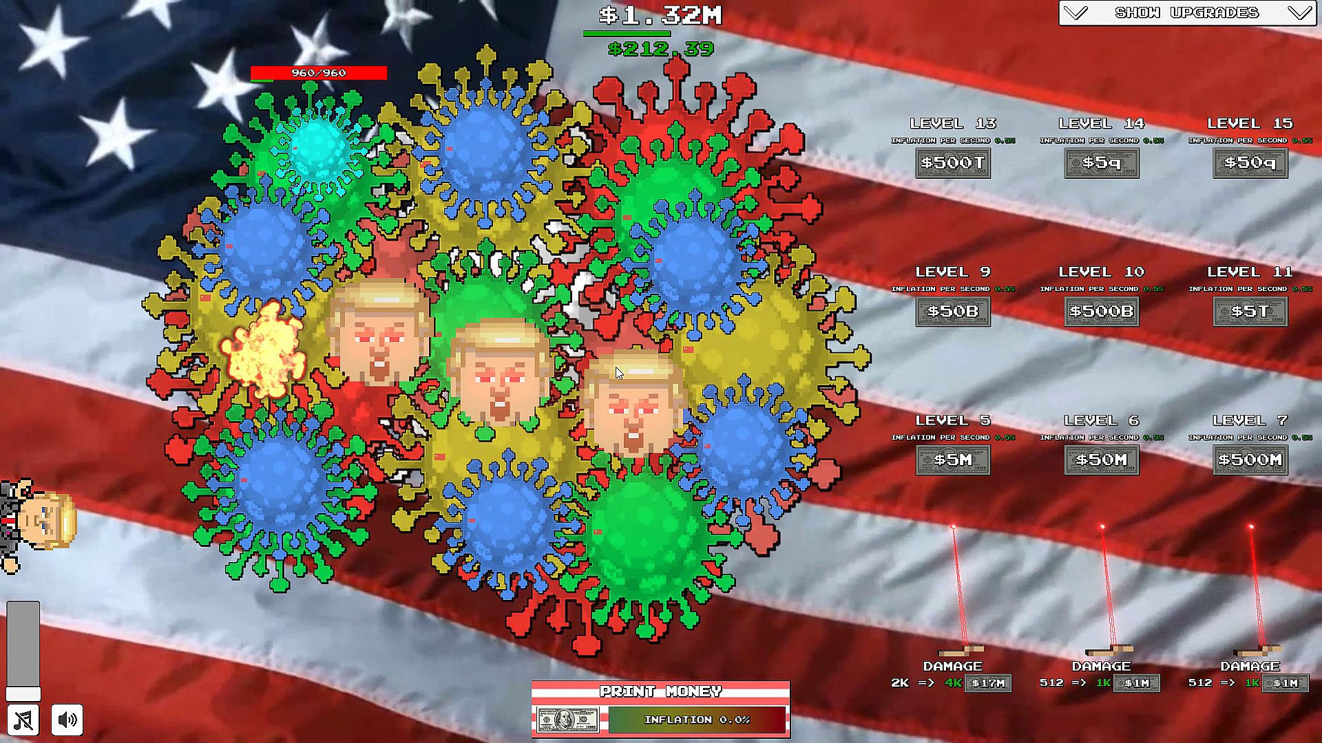 It's time to defeat coronavirus once and for all! Donald Trump himself asks your help for this fight. He has a great plan to use nuclear weapon and all USA resources to destroy that nasty virus. Satirical humor and perfectly balanced clicker gameplay will make you spend a lot of time with fun and pleasure.