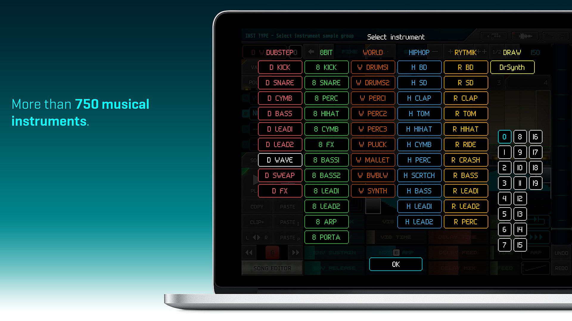 Rytmik Ultimate comes with a sound library of more than 750 instruments containing the libraries of the previous Rytmik series (Rytmik, Retrobits, Hiphop King and World Music) and adding a brand new set of samples ranging from deep dubstep kicks and basses to cutting synth leads and special effects.