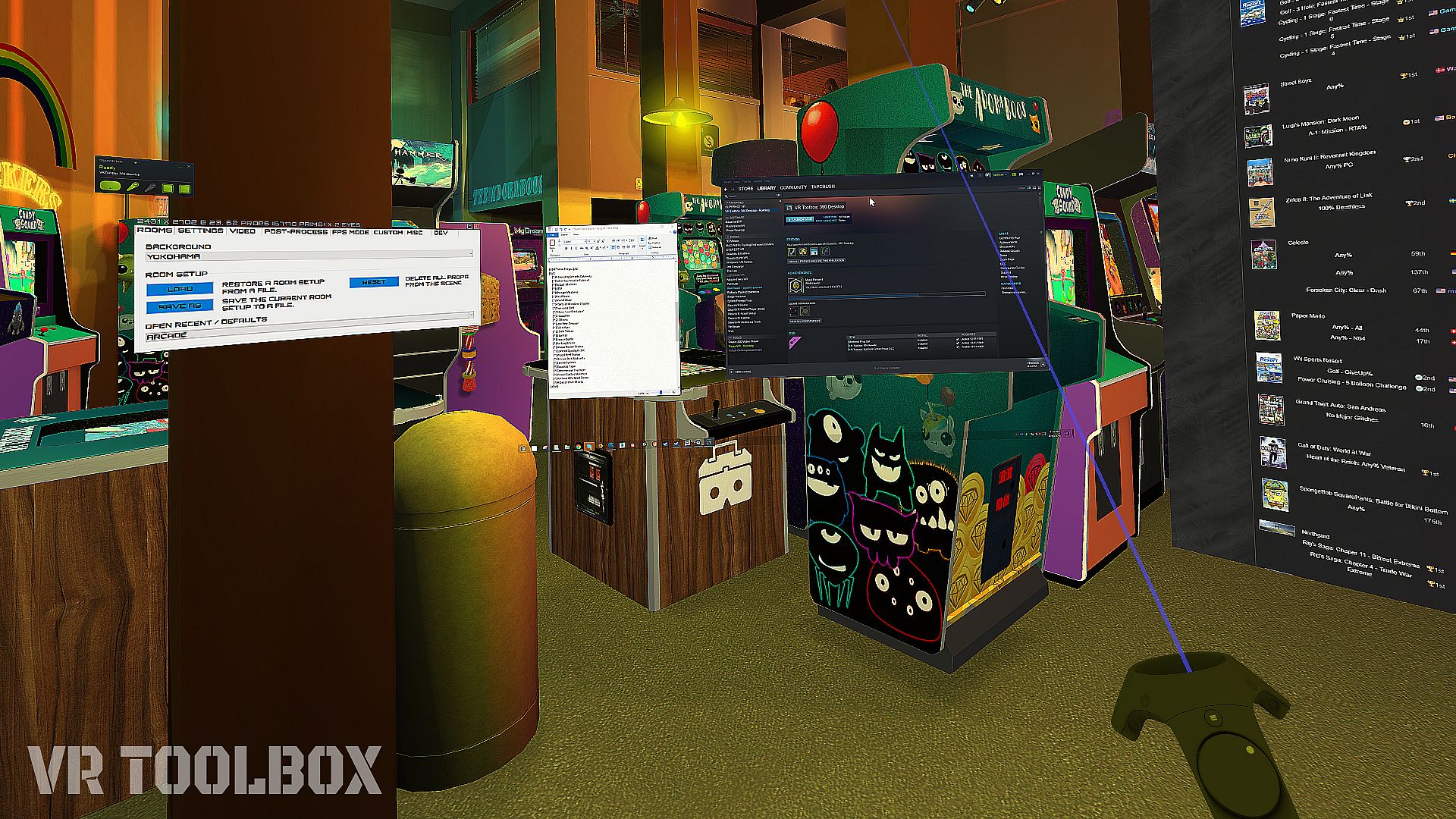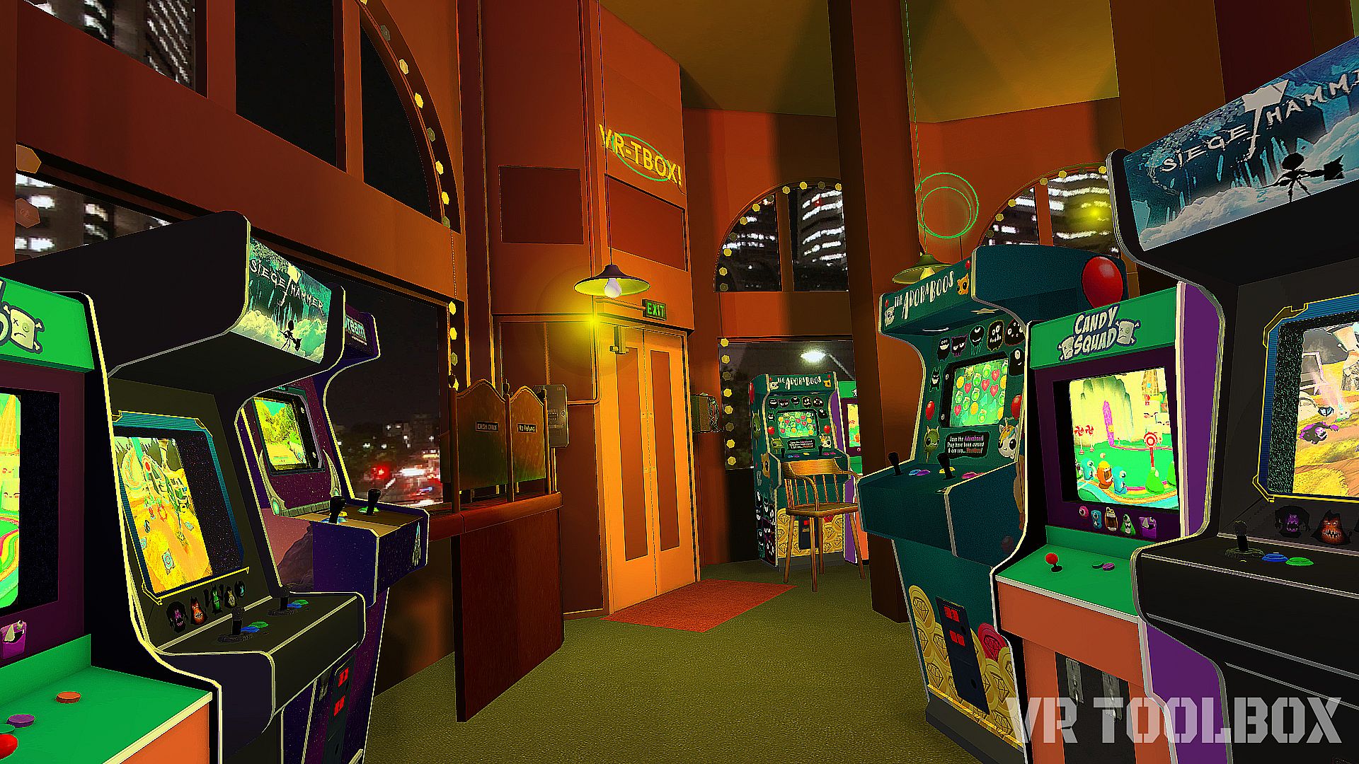 We've added two new rooms to VR Toolbox and all the props that come along with them. This new DLC will take you back to the 80's in a time when coin-operated (coin-op) arcades were in their golden age (late 1970's to mid 1980's). This arcade is inspired by one of the teams favorite 80's movies, in relation to VR! It will give you a bright colorful space to work in. The depth in this scene exceeds our previously released rooms so we hope this room takes your VR experience to the next level.