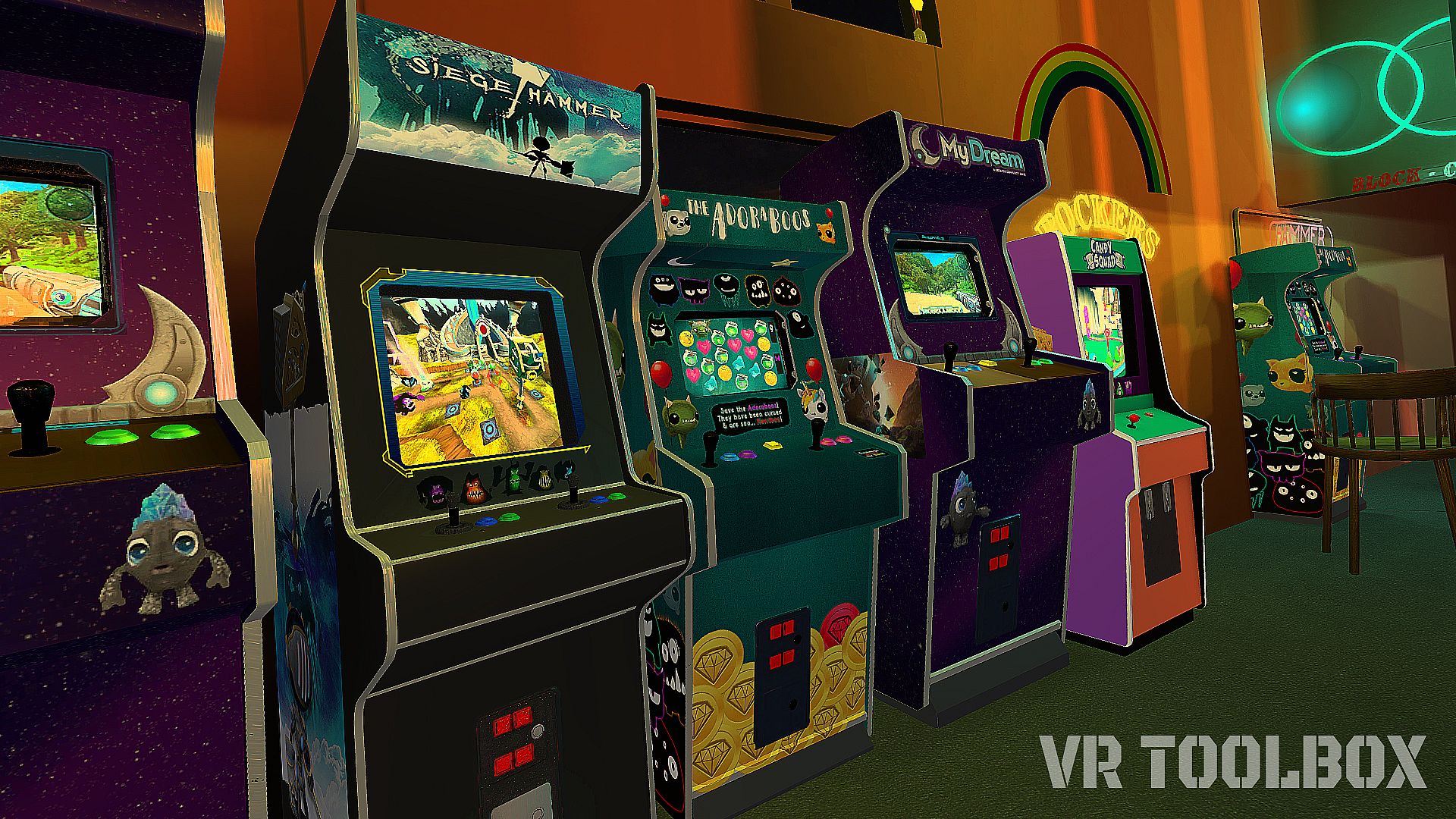 *The included Arcade machines and Pinball machine are themed after MyDream Interactive's growing game list. Including our original voxel-game self-titled "MyDream", our first VR game "Siege Hammer," a kids VR game "Candy Squad," and the latest game "The Adoraboos" for iOS and Android.