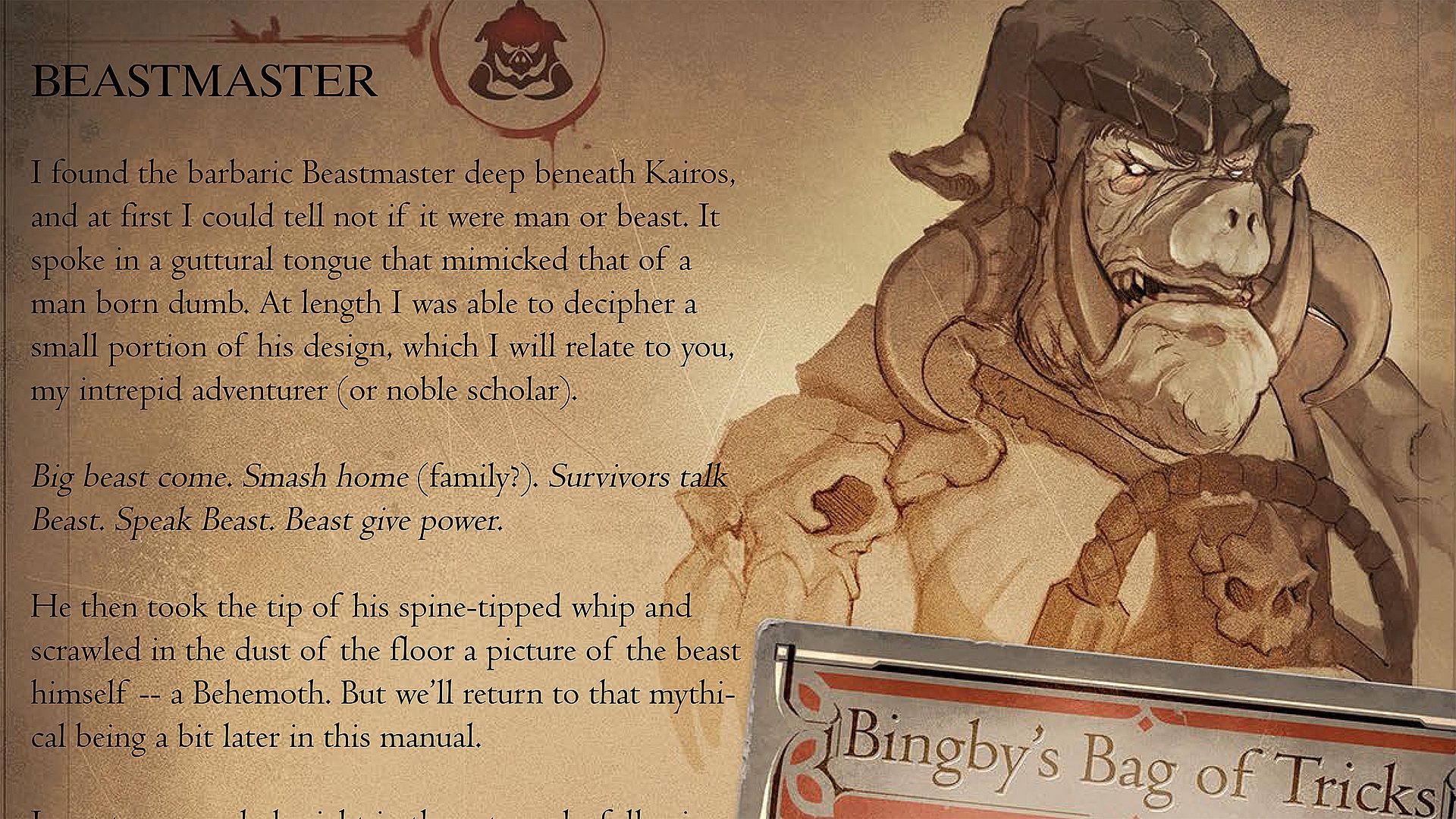 A 48-page PDF that serves as a love letter to the old-style manuals that you used to get with games. Filled to the brim with awesome art and lore about the world of Kairos and its denizens, there's no better way to discover the world you're going to conquer!