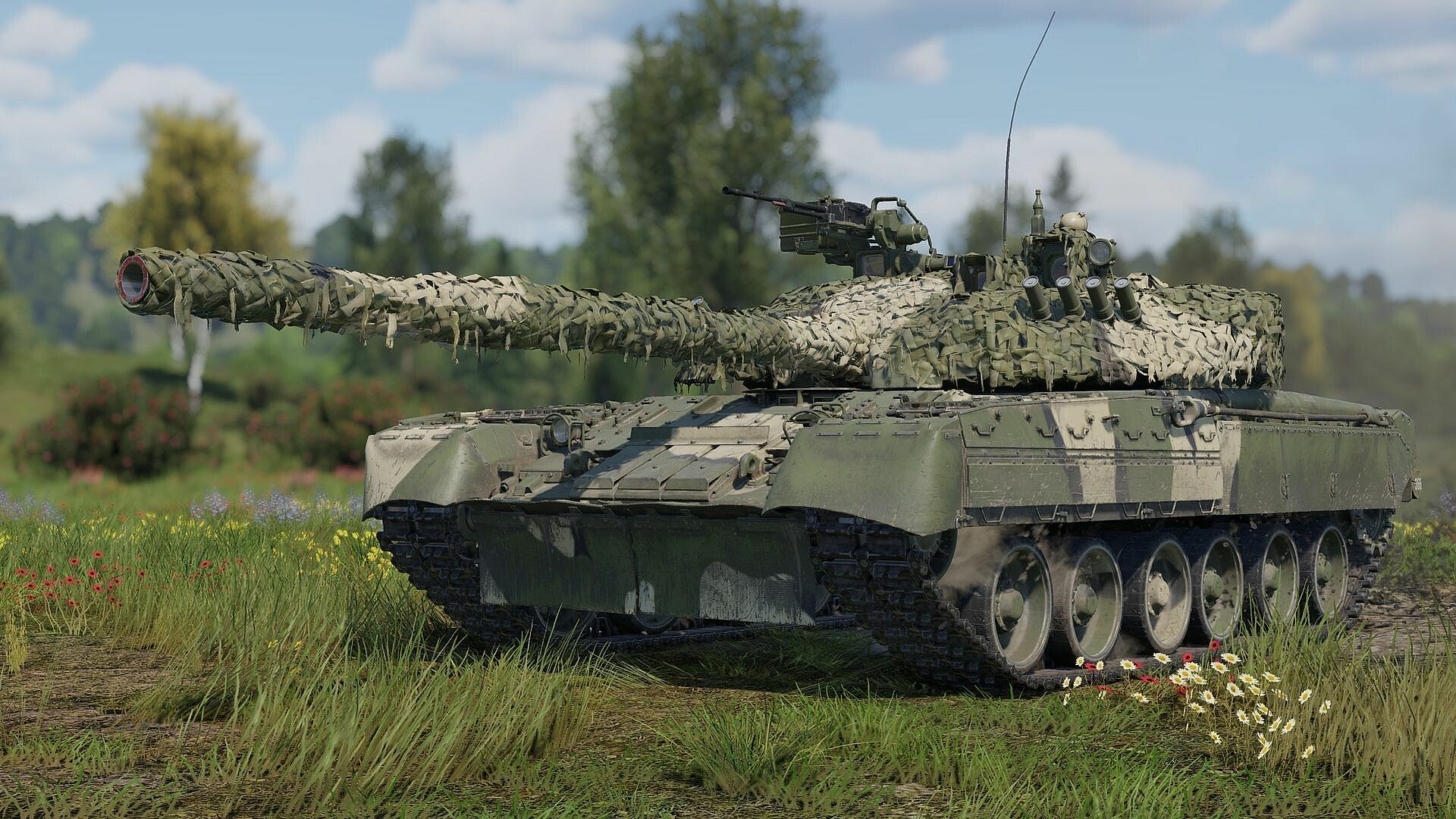 This modernized variant features an advanced second-generation thermal imager, and combined with its laser rangefinder and APFSDS rounds, the T-80U-E1 becomes a lethal long-range sniper. The camo netting helps here too, disguising the turret when hull down. You can also fight on the frontlines effectively thanks to the powerful 1250 hp engine and armor, complete with Kontakt-5 ERA blocks coating the hull and turret, which will often catch and defeat incoming projectiles. It has a 6.5 second autoloader and can also fire guided tandem-warhead missiles, ideal for helicopters or targets on the move.