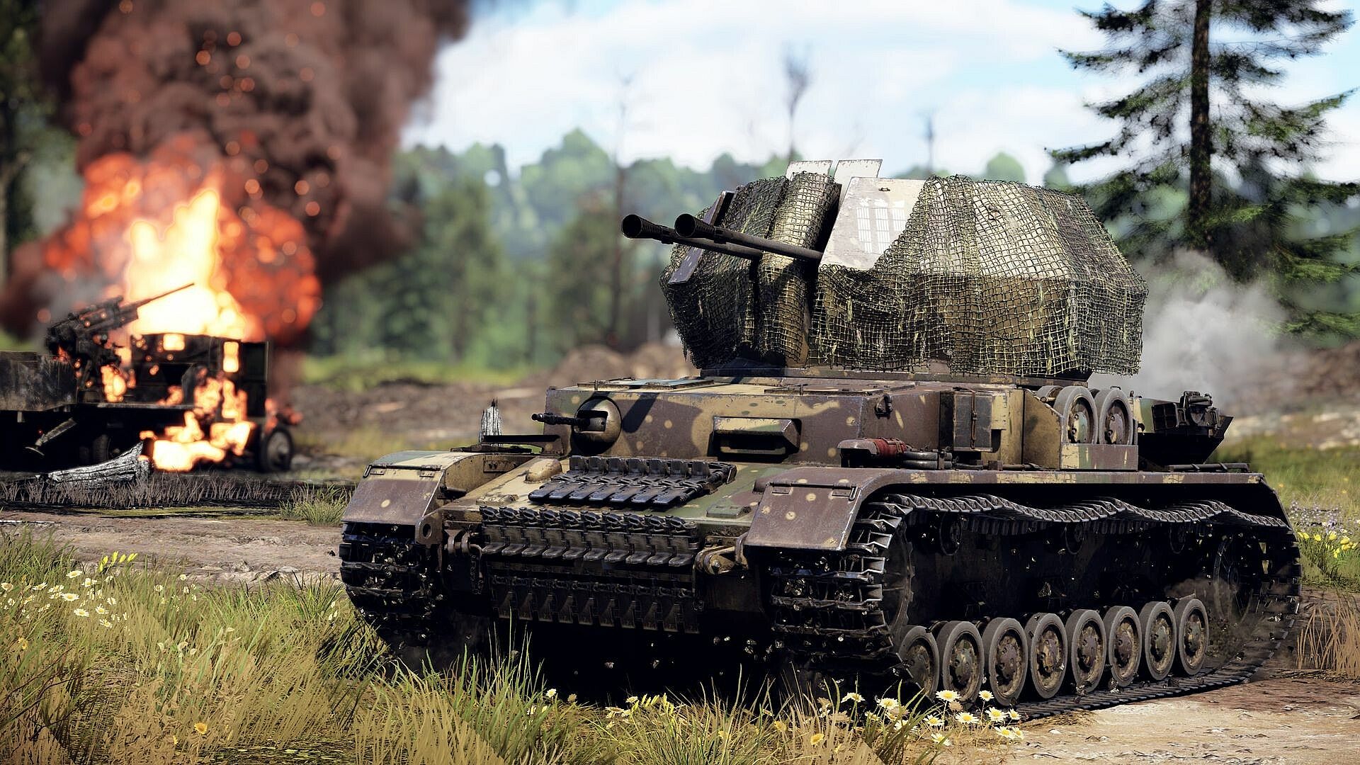 Protecting the skies is the premium Ostwind II, complete with camouflage netting and Ostketten tracks, increasing its mobility over rough terrain. Its pair of 37 mm Flak44 cannons can equip both APHE and HE rounds, allowing you to shred lightly armored vehicles and disable heavier ones, and take aircraft out of the sky with only a few hits!