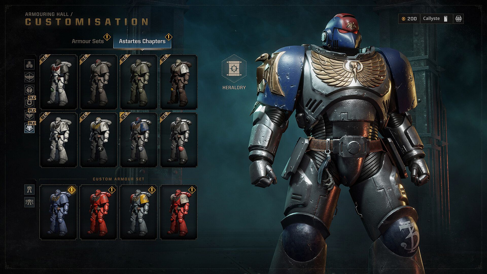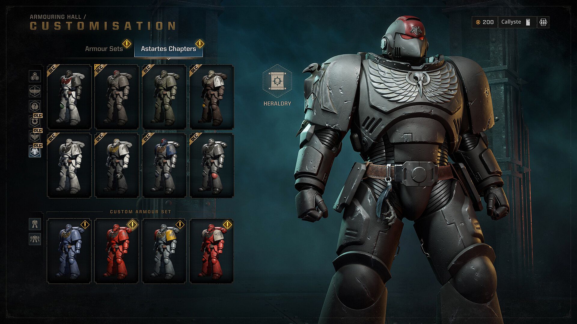 This DLC contains more than 40 cosmetic items and options including chapter heraldry for the left and right pauldrons, decals, unique helmets, knee markings, and colour packs from 8 Raven Guard chapters: