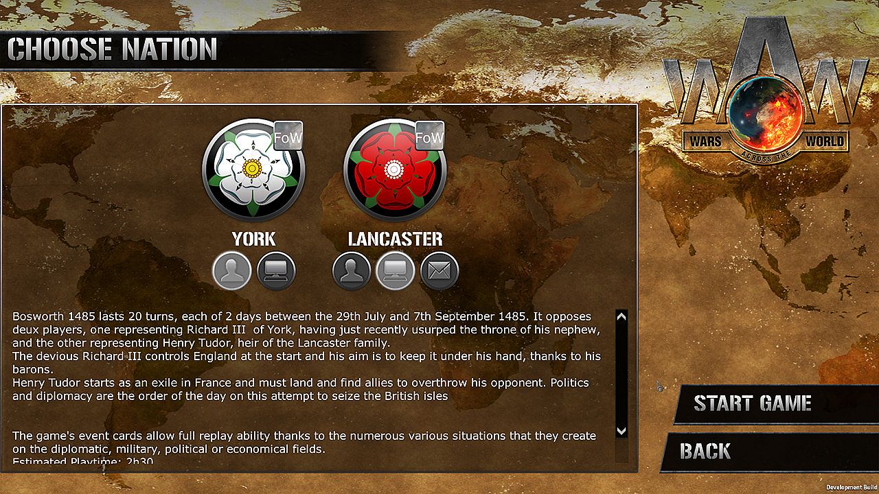 Bosworth 1485 lasts 20 turns, each of 2 days between the 29th July and 7th September 1485. It opposes two players, one representing Richard III of York, having just recently usurped the throne of his nephew, and the other representing Henry Tudor, heir of the Lancaster family.