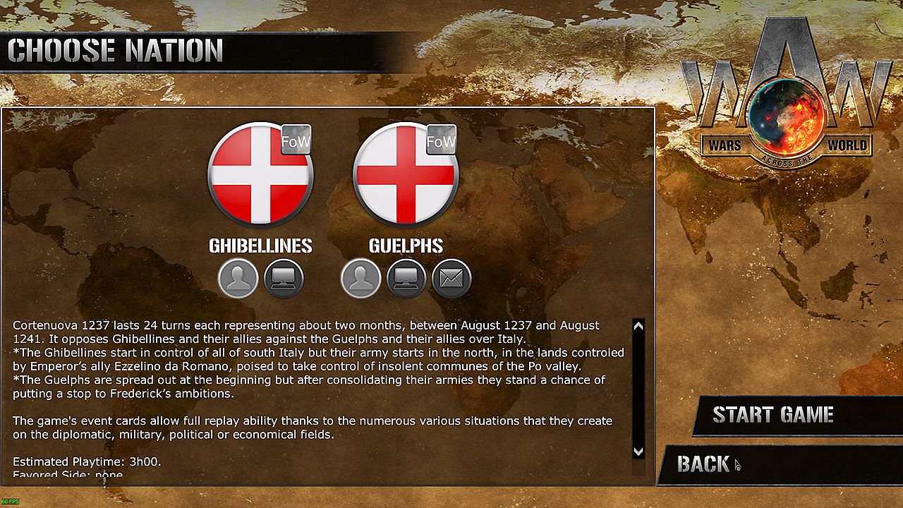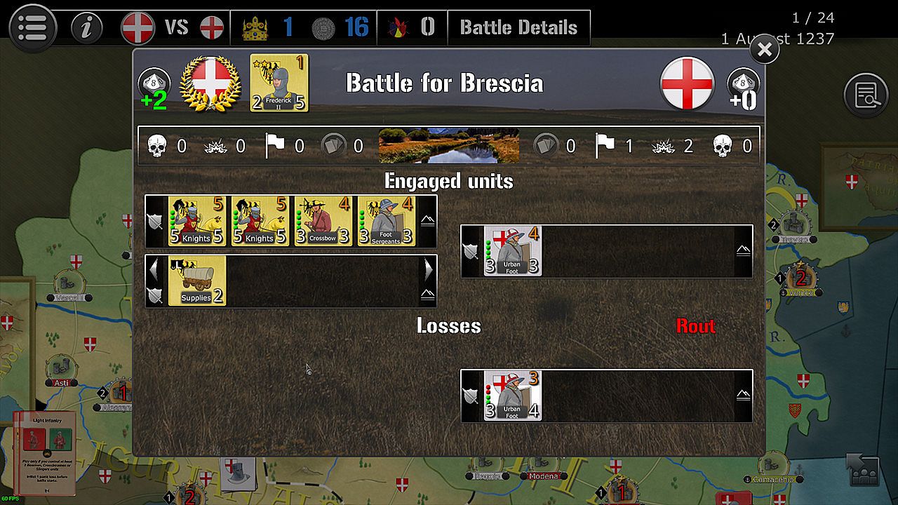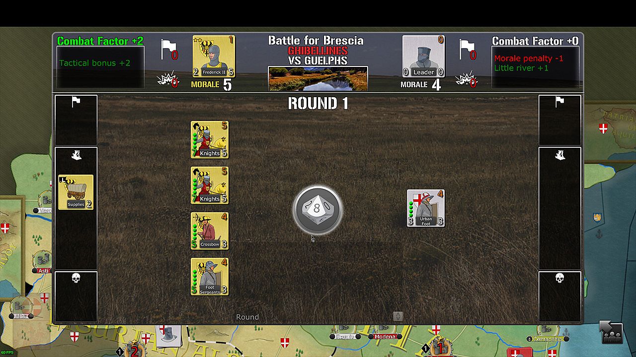 Cortenuova 1237 is based on the conflict between Guelphs and Ghibellines in XIII century Italy. The Ghibellines, led by Holy Roman Emperor Frederick II, are attempting to restore Imperial power south of the Alps while Guelphs, led by Pope Gregory IX, are opposing restoration of imperial power in the north and are trying to break Emperor’s allies in Italy.