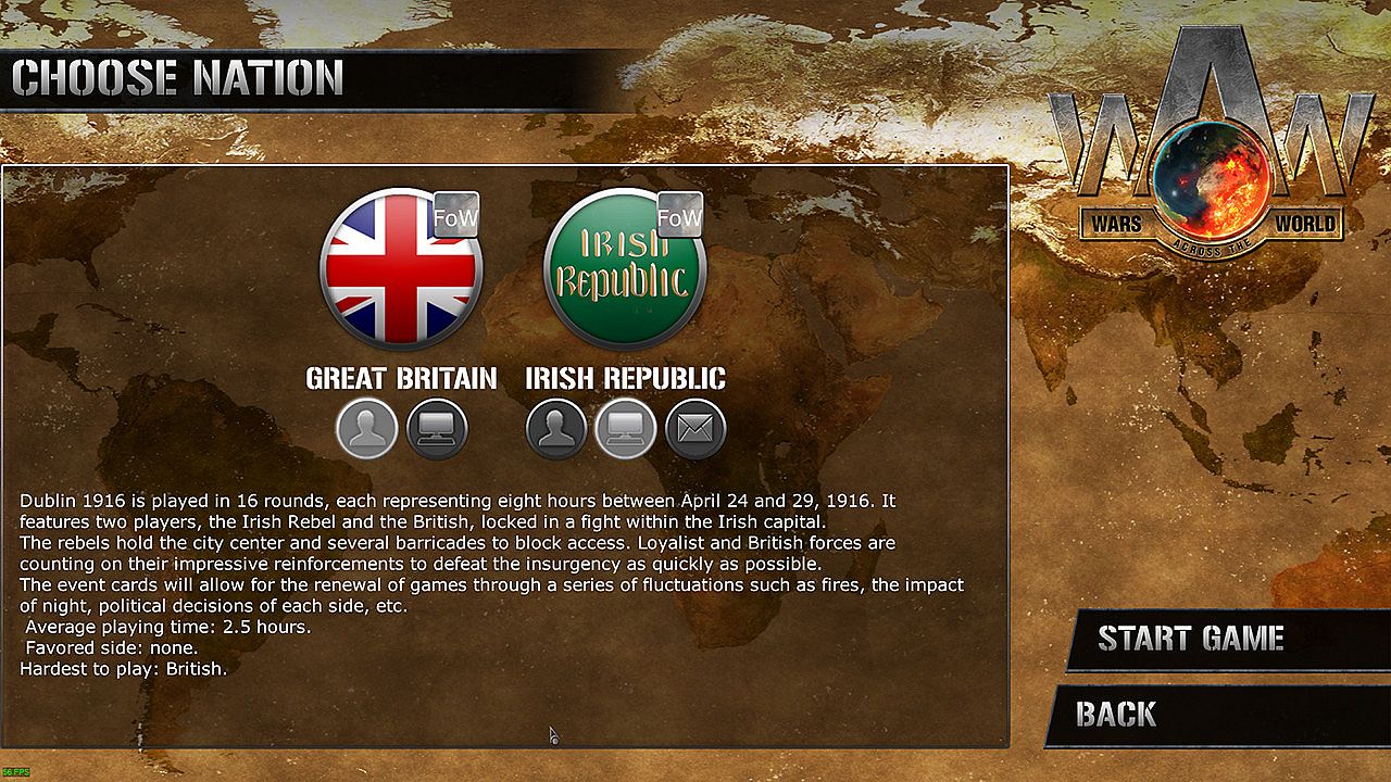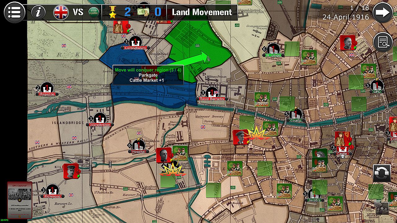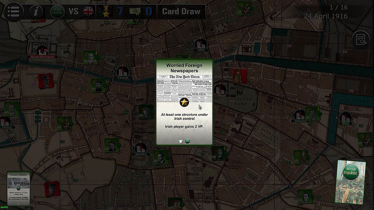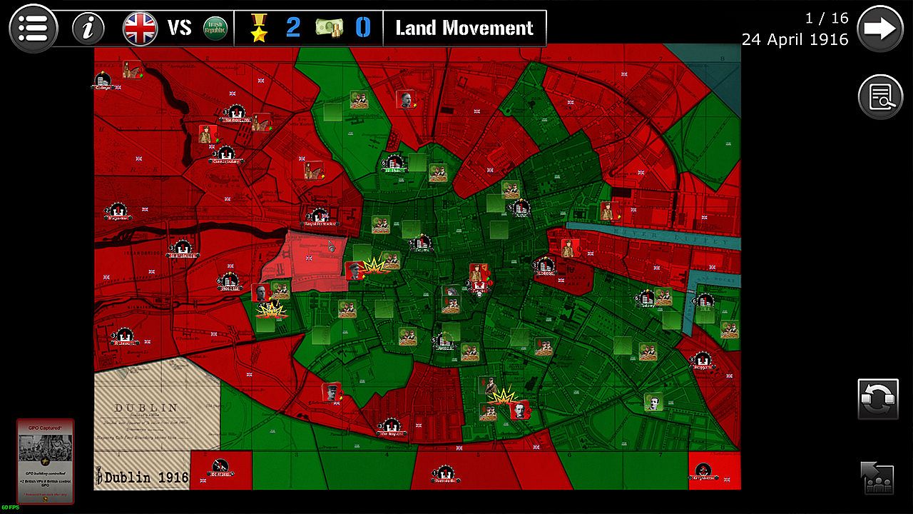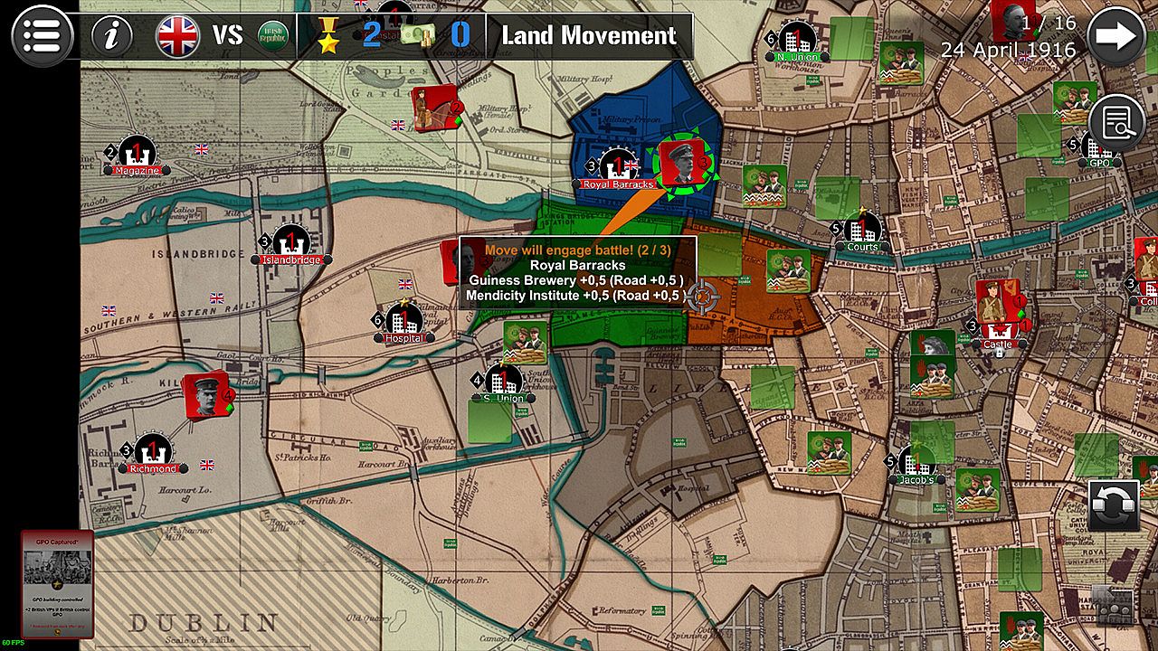 The Scenario lasts 16 turns (between April 24th and April 29th, 1916), each turn being equivalent to eight hours. The British player always plays first, followed by the Irish player.