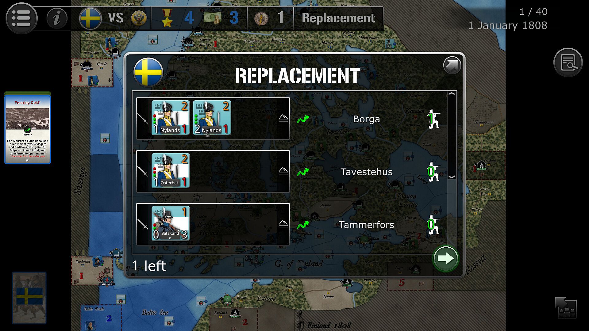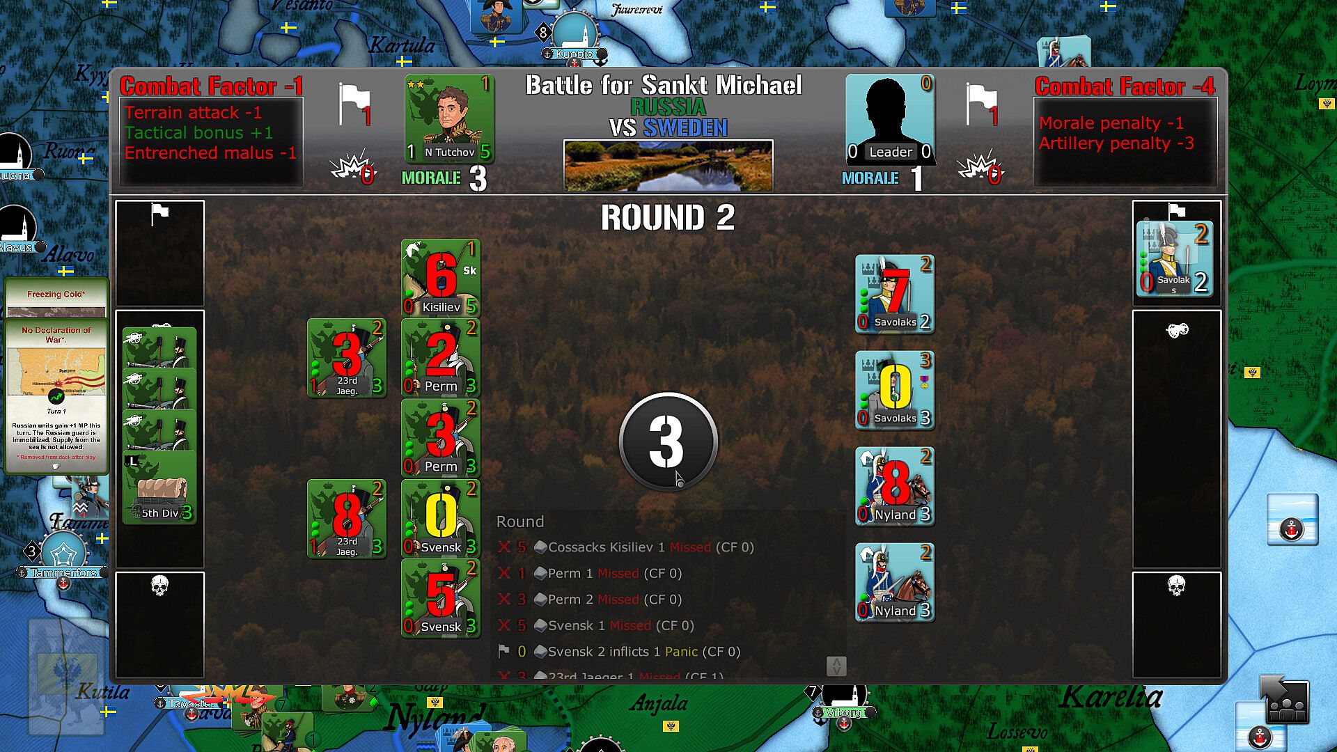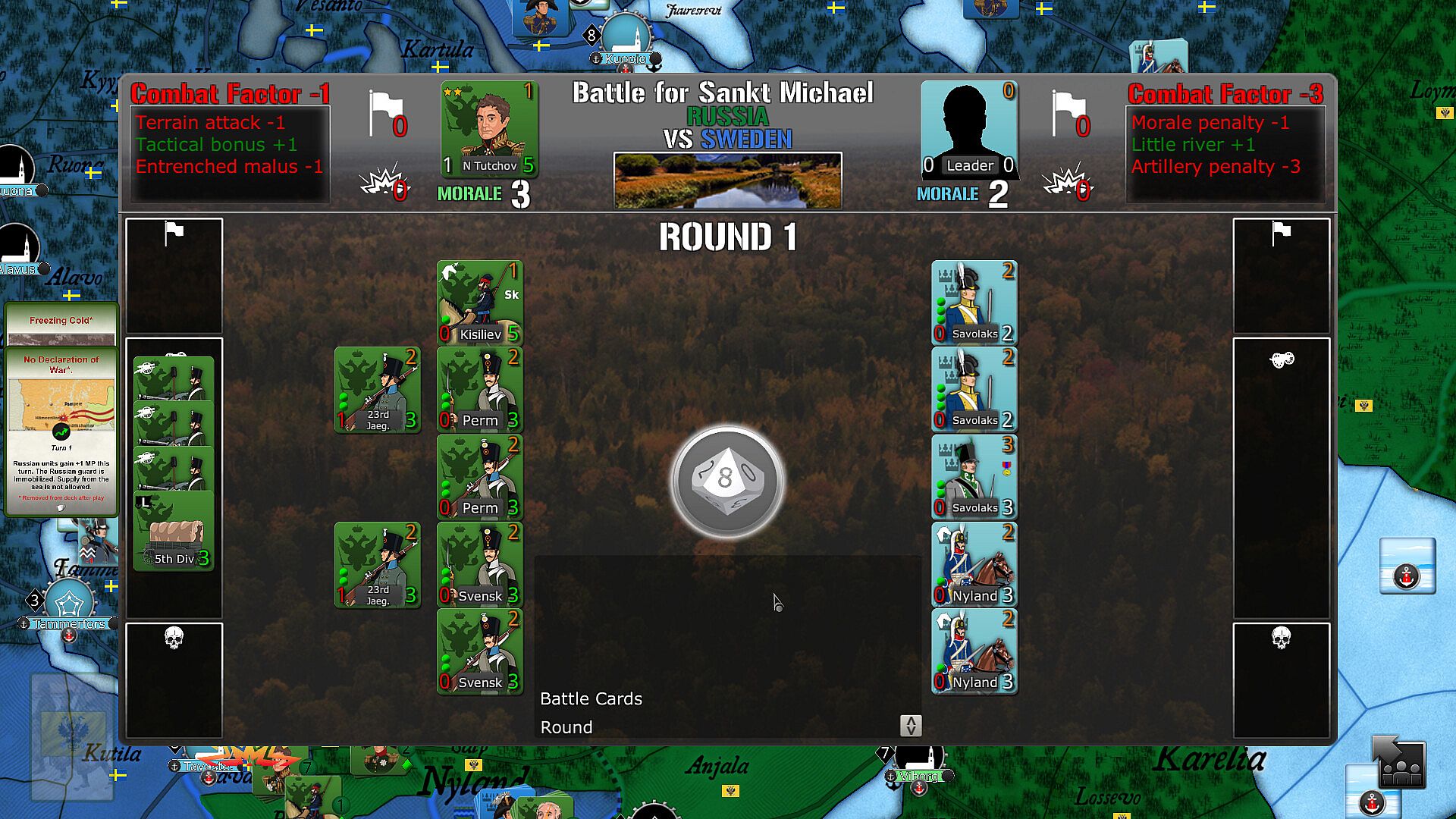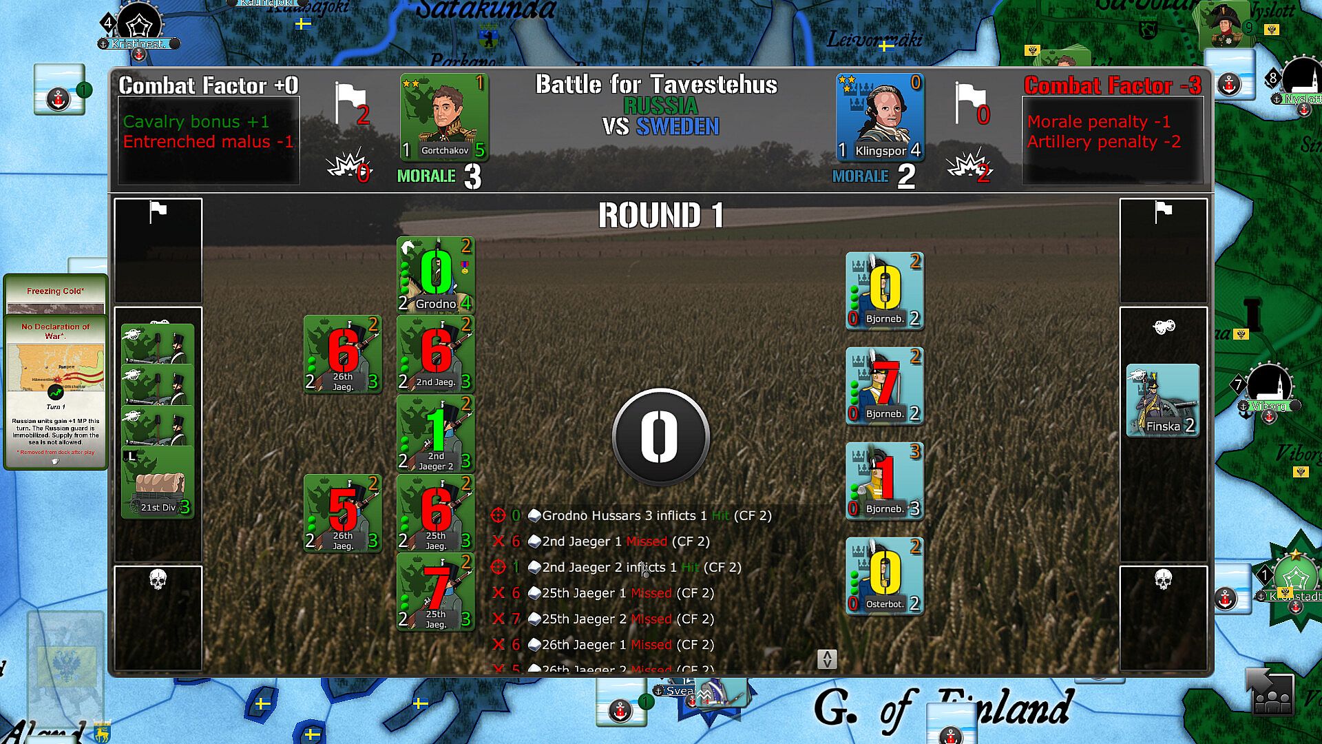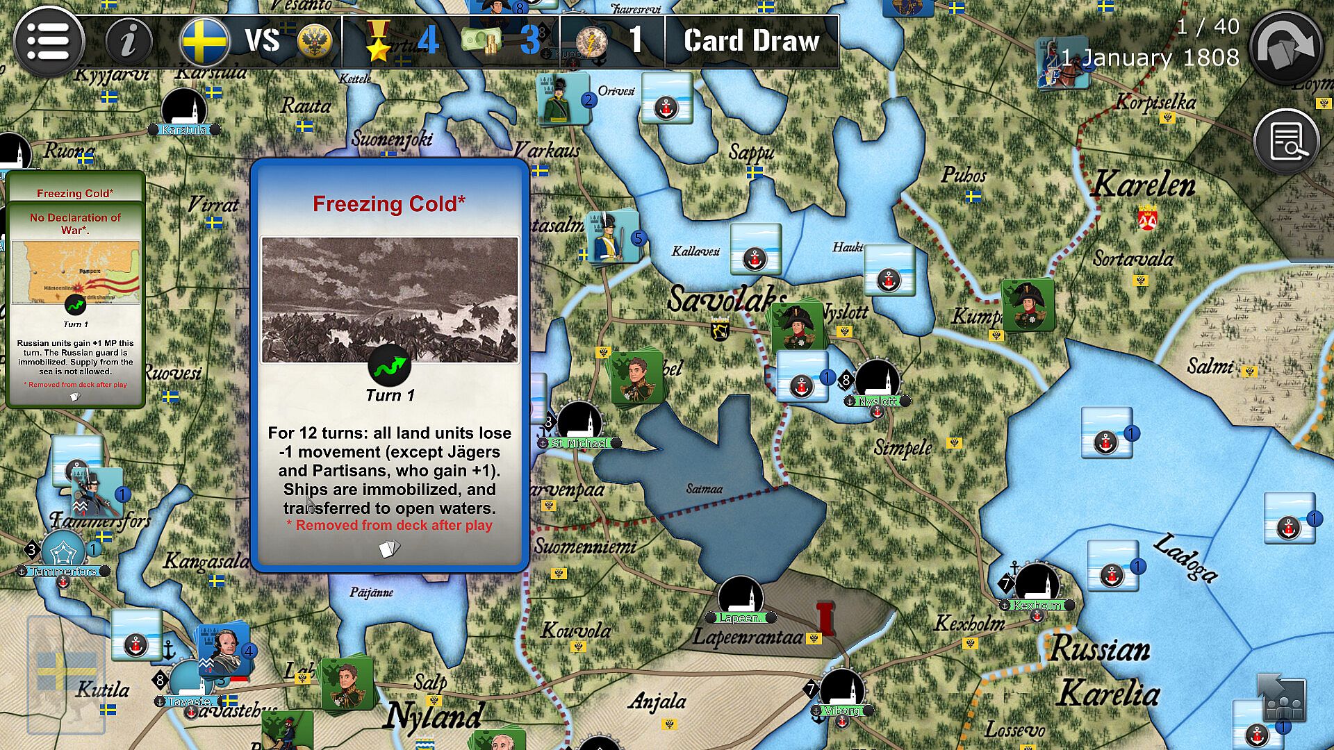 Finland 1808 is played in 40 turns, each representing two weeks between January 1st, 1808 and August 1st, 1809. It features two players, Russian and Swede, in the northern confines of Scandinavia.
