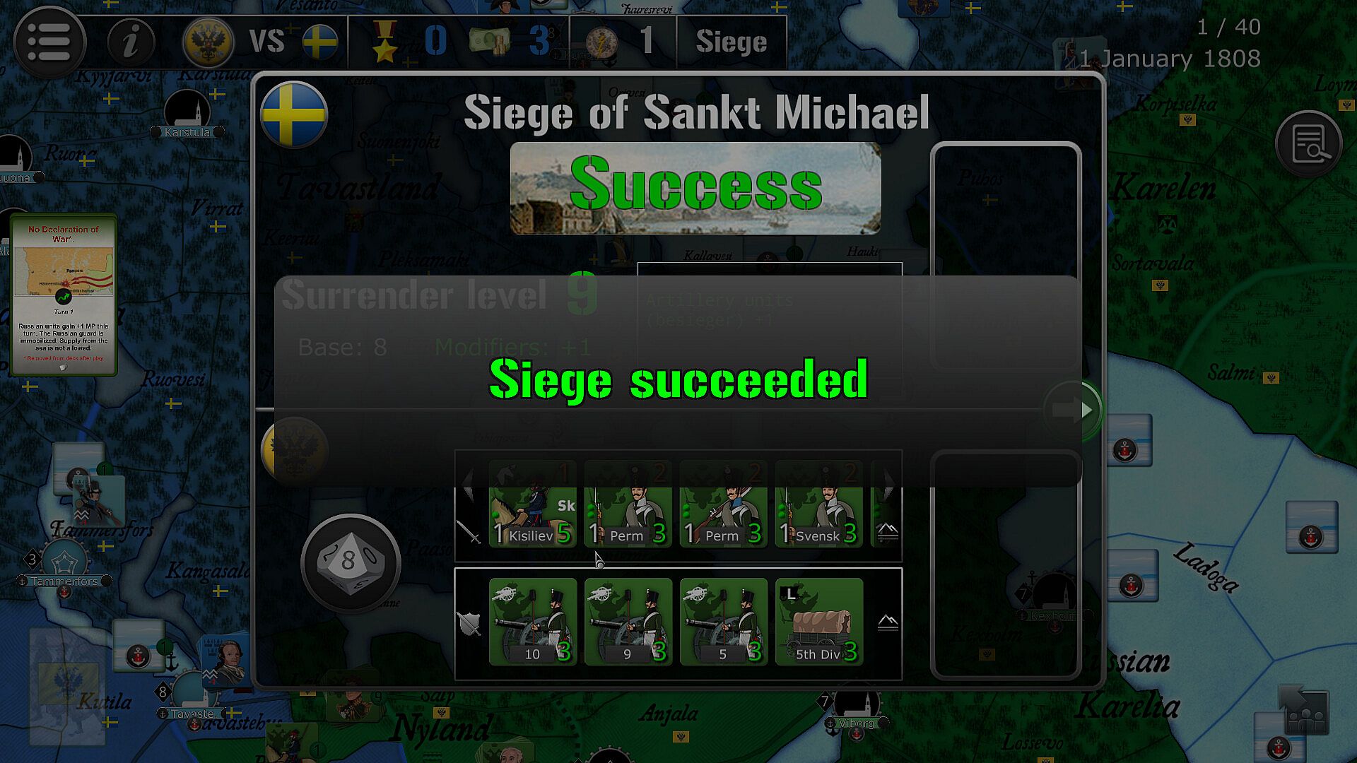 Finland 1808 simulates the conquest of Finland by the Russian Empire in its war against the Kingdom of Sweden. The Russian armies must take all of Finland and all or part of the remaining Swedish territory as quickly as possible. The Swedes must oppose this offensive and hold out until the damage of the continental blockade imposed by Napoleon ruins the war economy of the Czar.