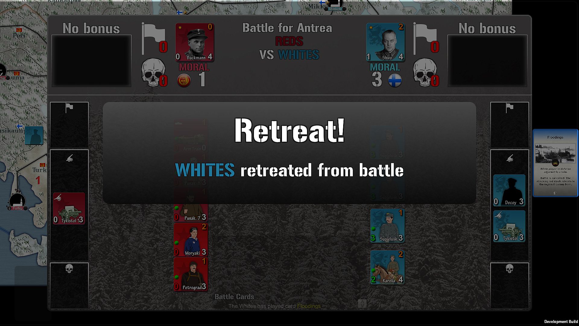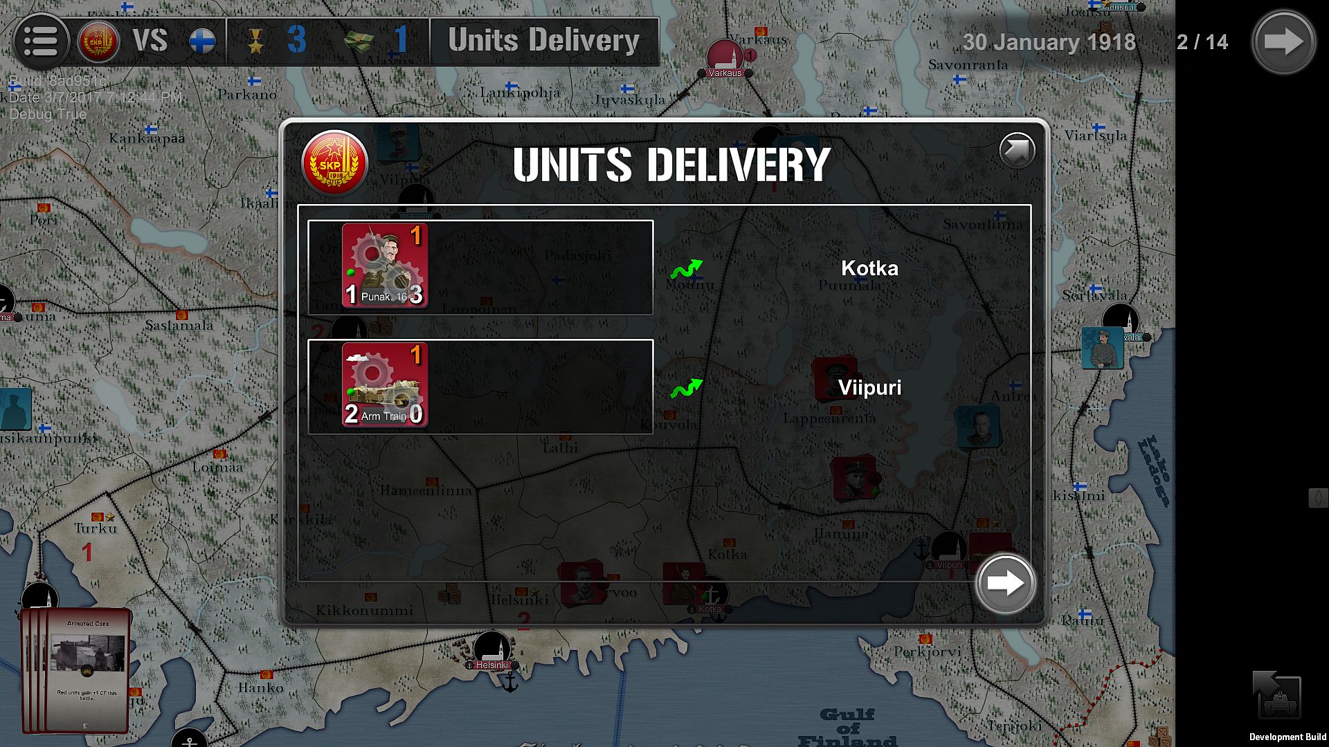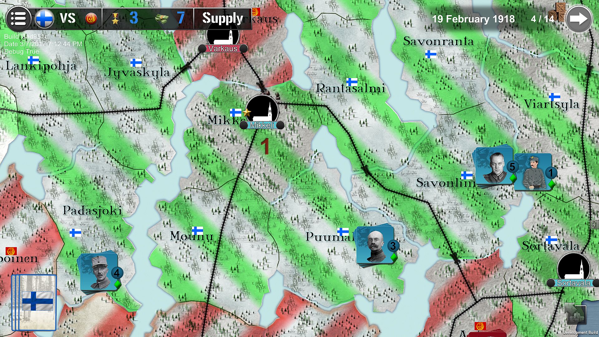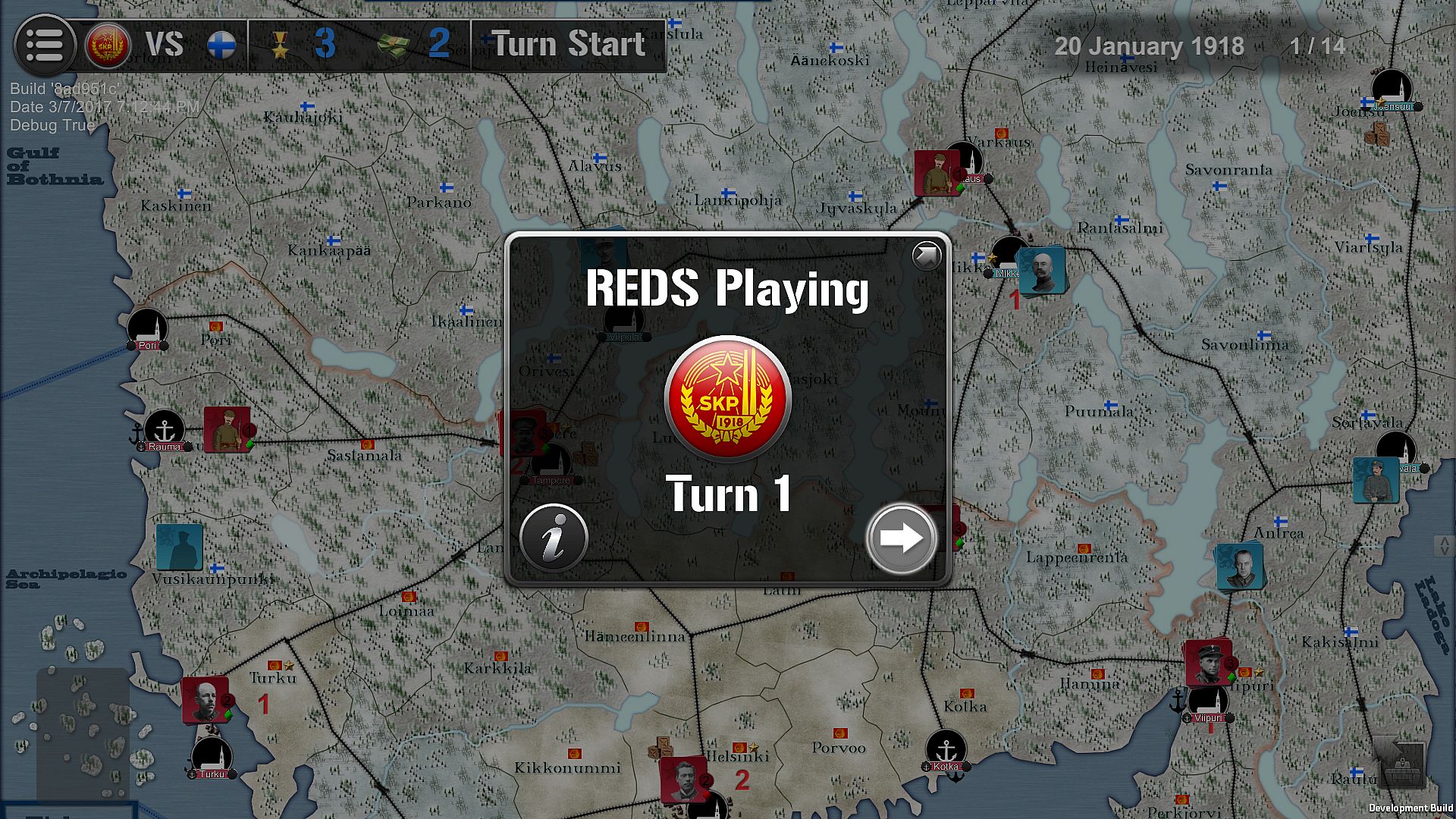 Finland 1918 lasts 14 turns of 10 days between January and May 1918. Two players are facing each other: the Communist partisans in the south of the country, backed by Petrograd, opposed to Nationalist militias of general Mannerheim in the north. The land is quite hard and armored trains are the best and strongest ways to move quickly between fronts.