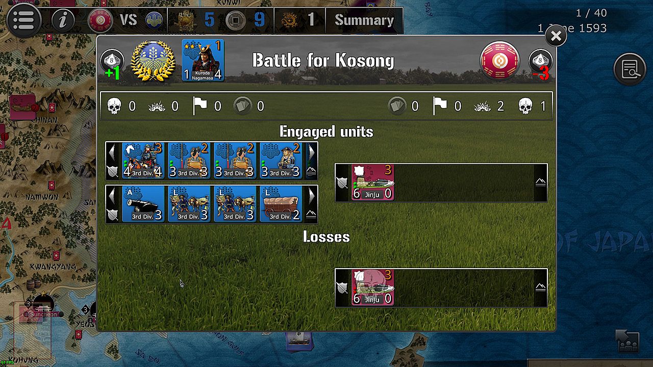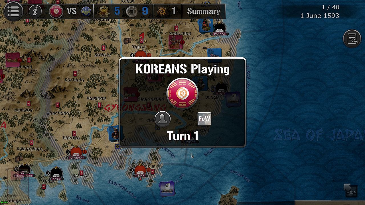 Korea 1592 lasts 40 turns, each representing two weeks month between June 1592 and December 1593. One player represents the Samurai armies of Japan's master Hideyoshi, the other has the Koreans, with Joeson Koreans and Ming Chinese forces.