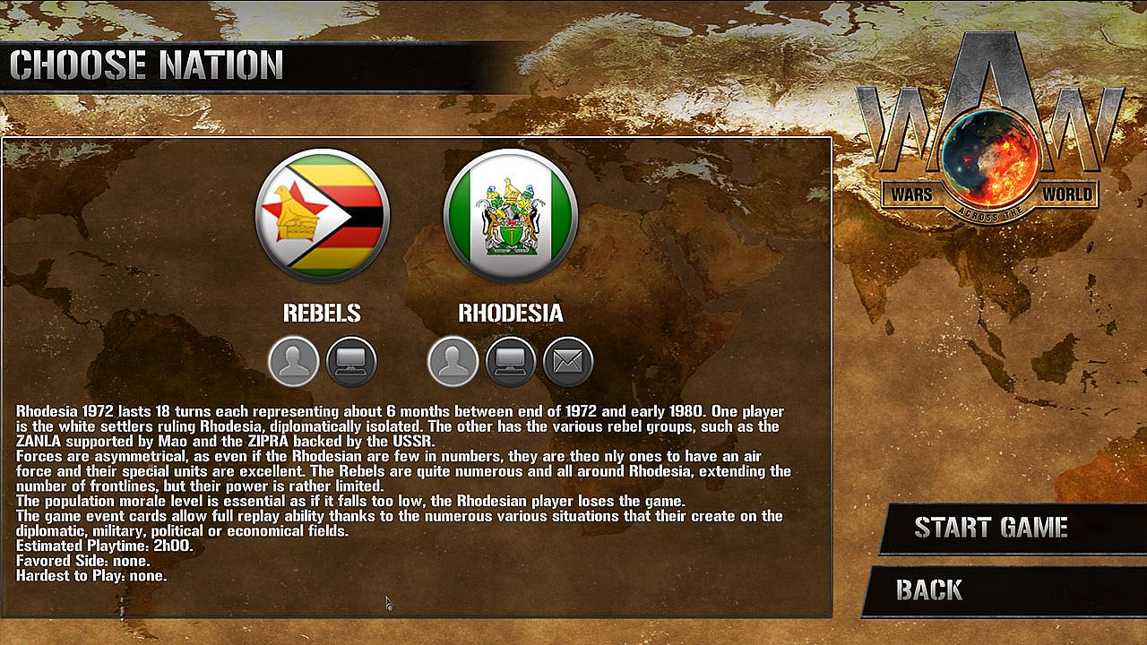 Before you start looking for a cheap Wars Across the World: Rhodesia 1972 CD Key, take a moment to check the essentials. Developed by Strategiae. Published by Plug In Digital. PC released date: 06 Dec 2018. Genres: Strategy, Indie. Categories: Family Sharing, Steam Trading Cards, Single-player, Downloadable Content, Steam Achievements, Shared/Split Screen.