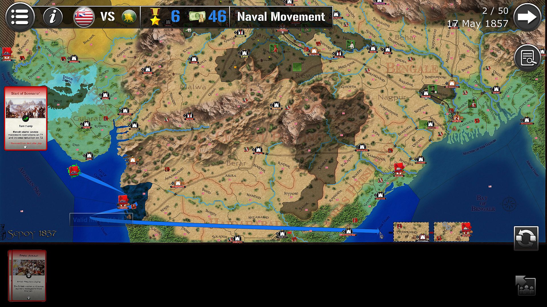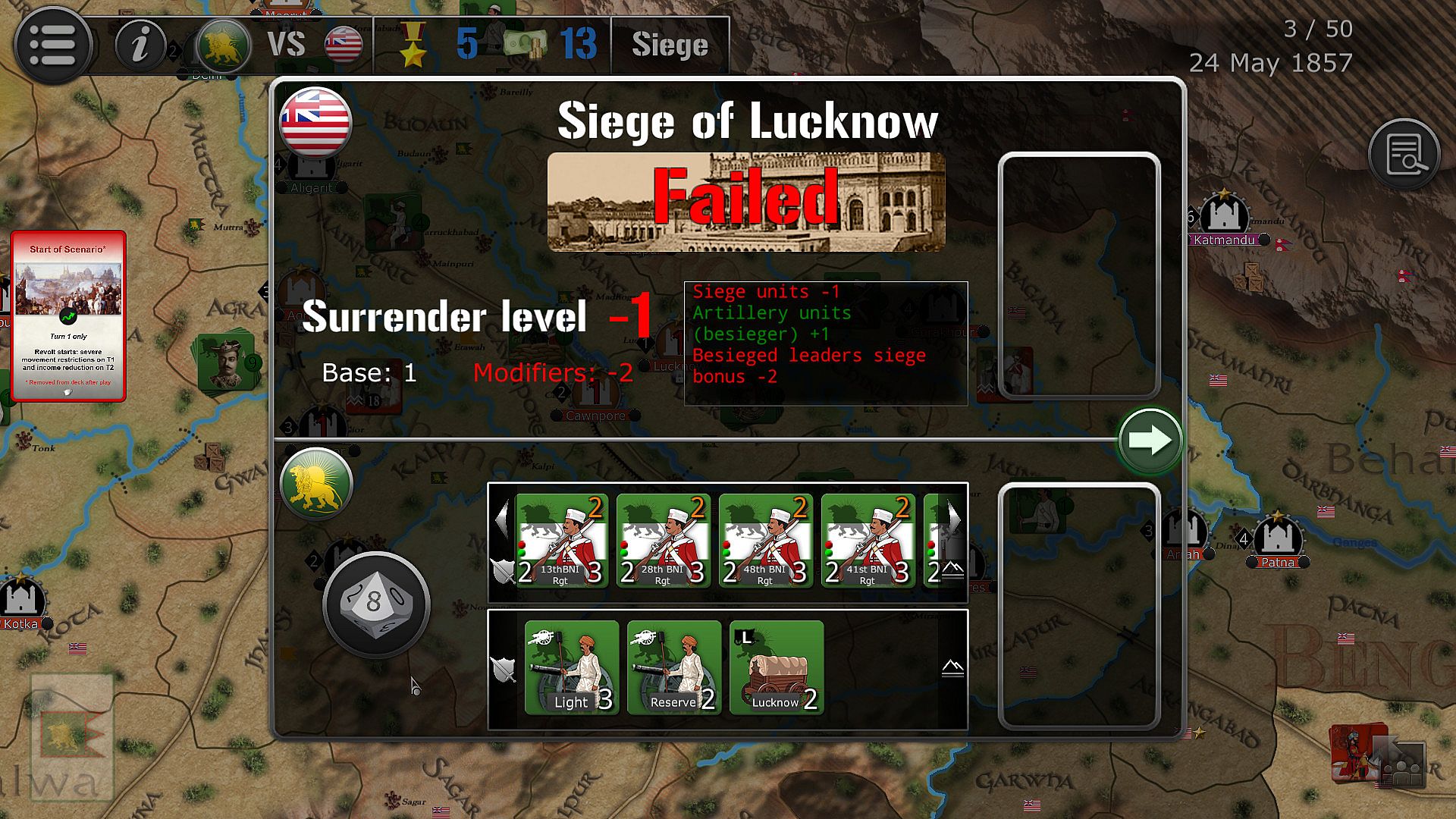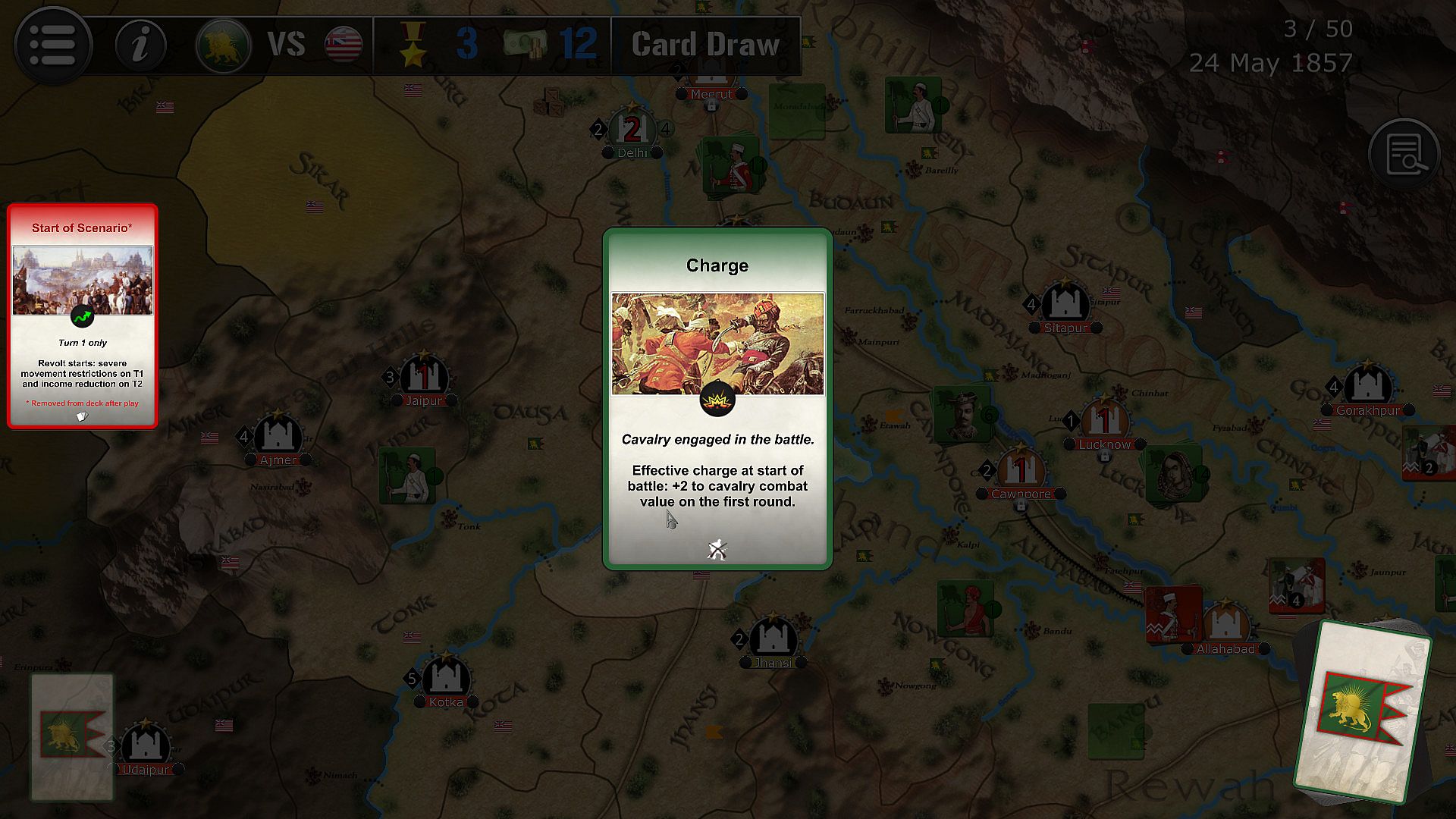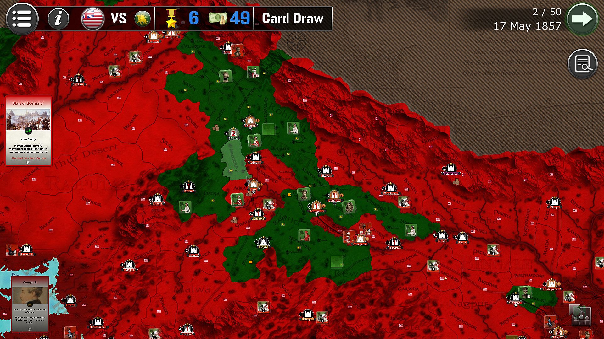 The game lasts 50 turns (between 10th May 1857 and 30th June 1858), each turn being the equivalent of 1 week.