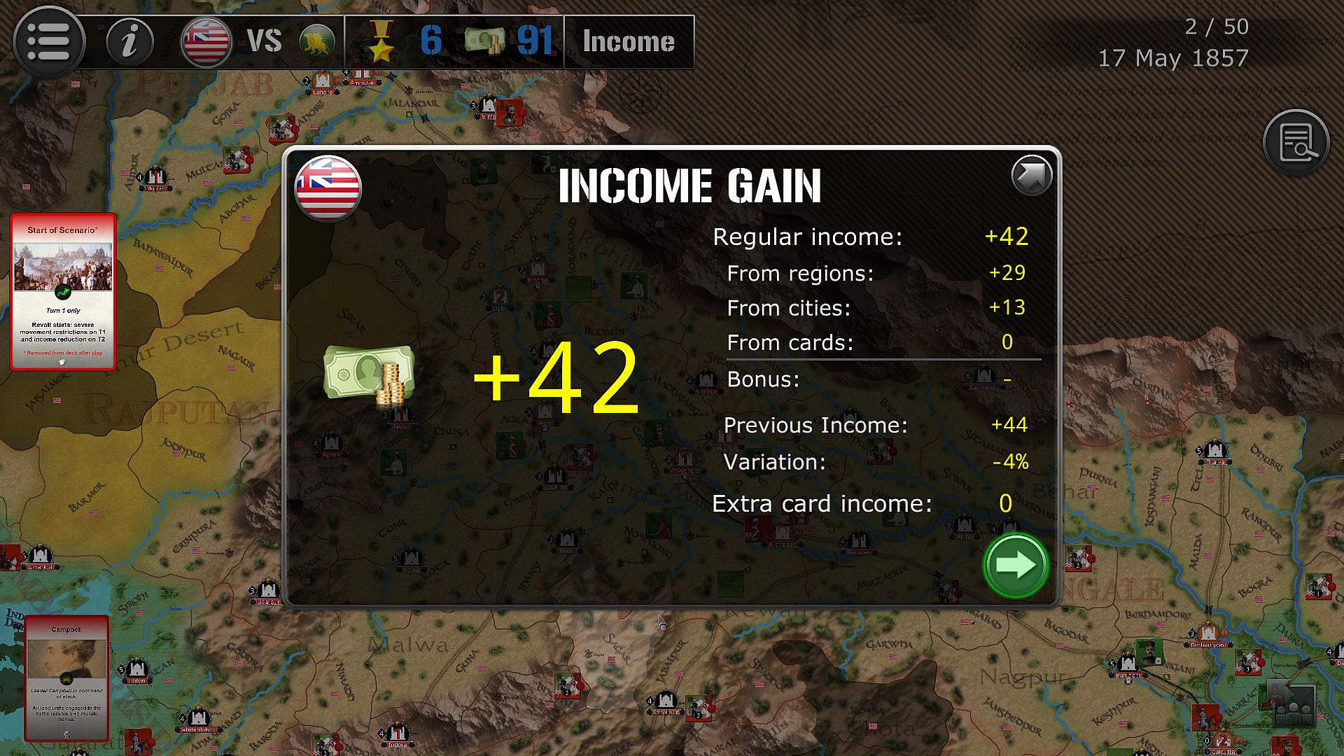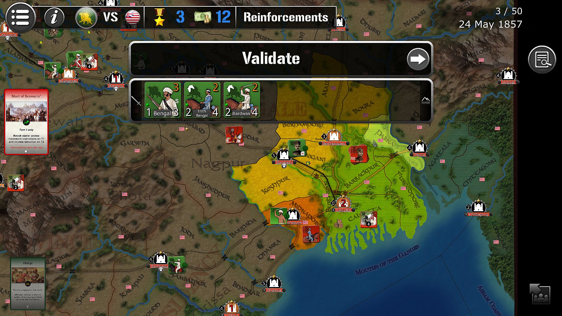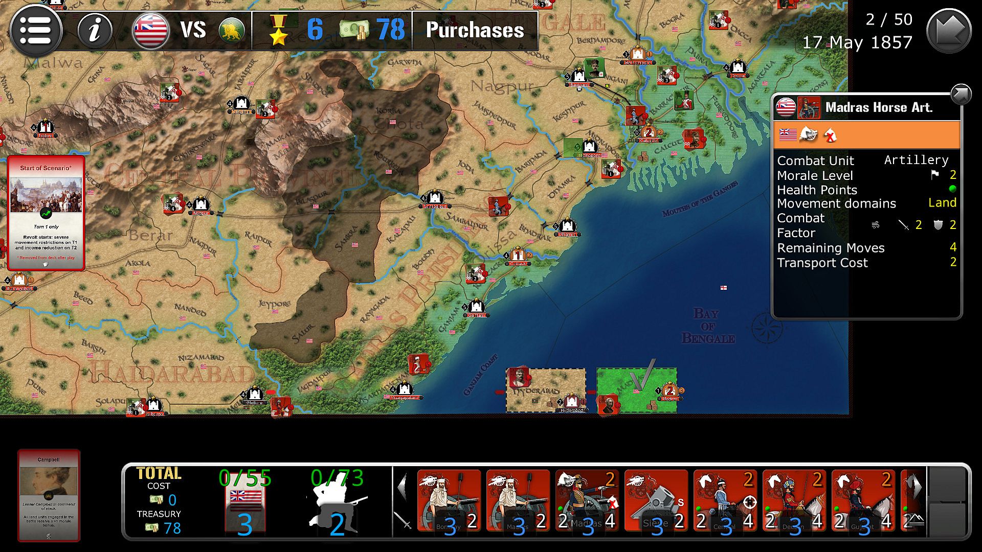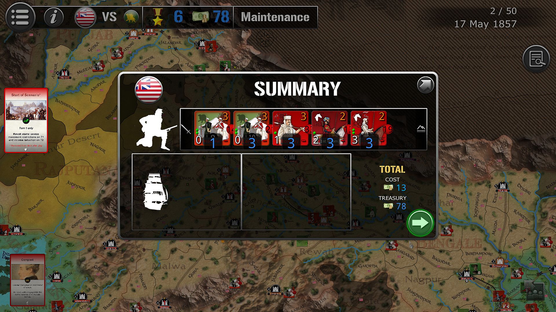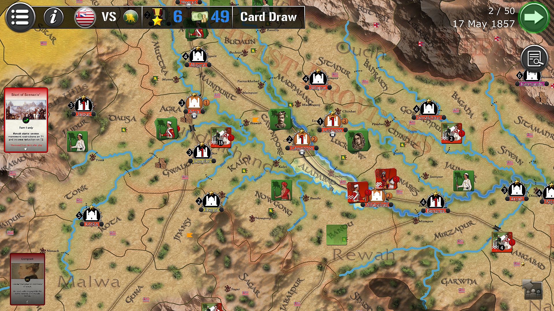 The game lasts 50 turns (between 10th May 1857 and 30th June 1858), each turn being the equivalent of 1 week.