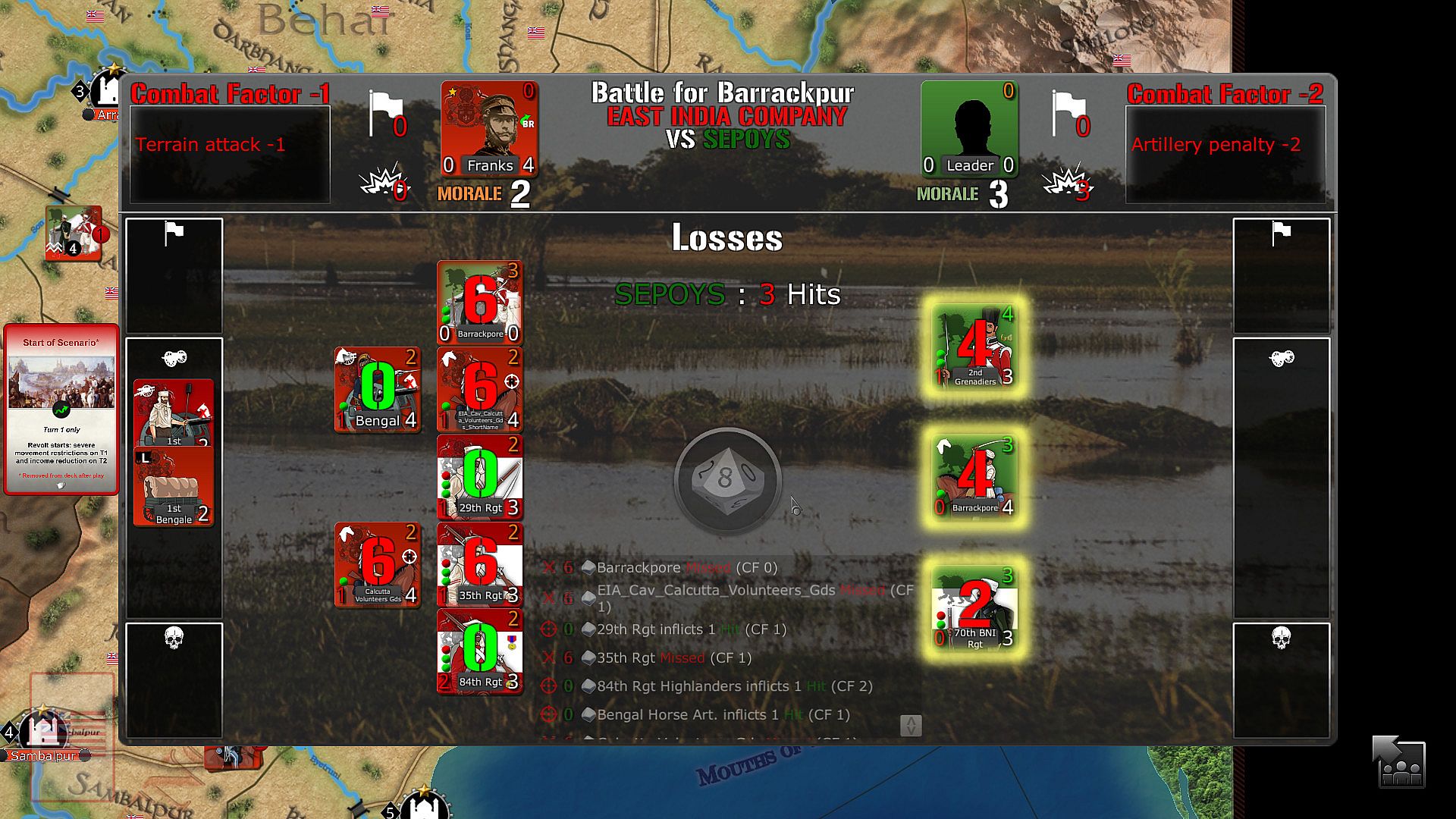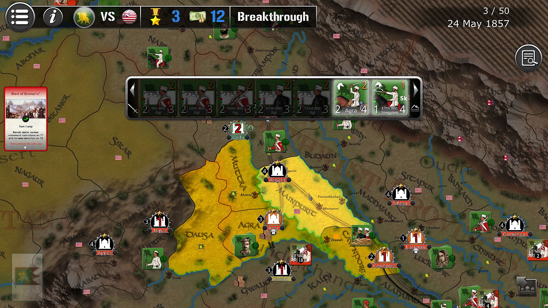 - Their opponent, the revolted Sepoys, has lots of troops early on but can’t so easily replace them if defeated too early. It must trade space for time, as victory comes with survival.