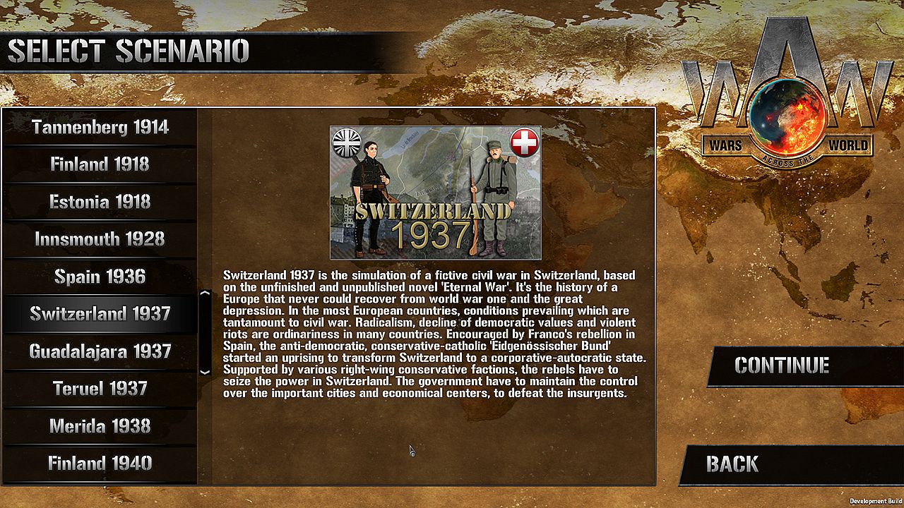 Switzerland 1937 is the simulation of a fictive civil war in Switzerland, based on the unfinished and unpublished novel 'Eternal War'.§§It's the history of a Europe that never could recover from World War One and the Great Depression. In most European countries, conditions prevailing are tantamount to civil war. Radicalism, decline of democratic values and violent riots are ordinary in many countries. Encouraged by Franco's rebellion in Spain, the anti-democratic, conservative-catholic 'Eidgenössischer Bund' starts an uprising to transform Switzerland into a corporative-autocratic state.