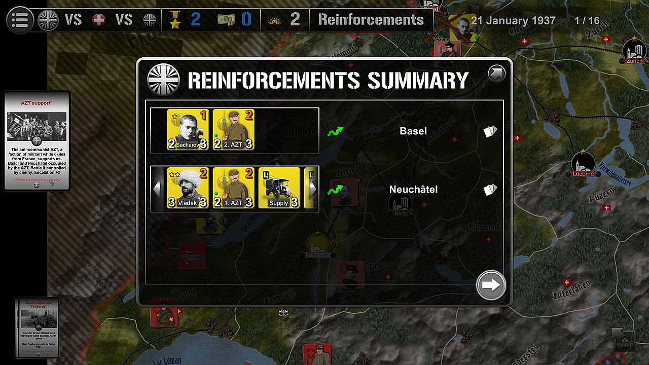 Switzerland 1937 is a campaign lasting 16 turns each representing a few days between January and March, 1937. It opposes the Government and the Rebels over Switzerland and Liechtenstein.