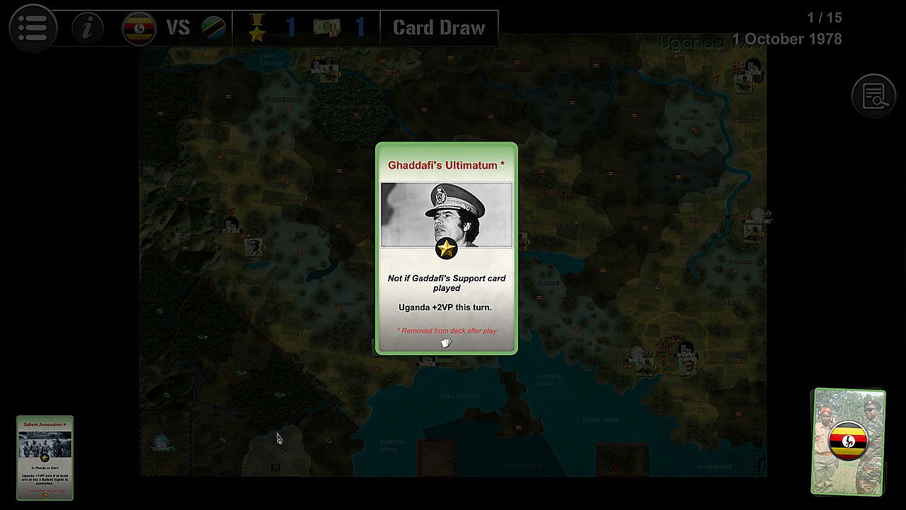 Uganda 1979 lasts 15 turns, each representing two weeks between October 1978 and May 1979. The two players are representing on one side forces of blood-thirsty Ugandan tyrant Idi Amin Dada and his ally Muhammad Kadhafi, and on the other the government of Tanzania fed up of his embarassing neighbor.