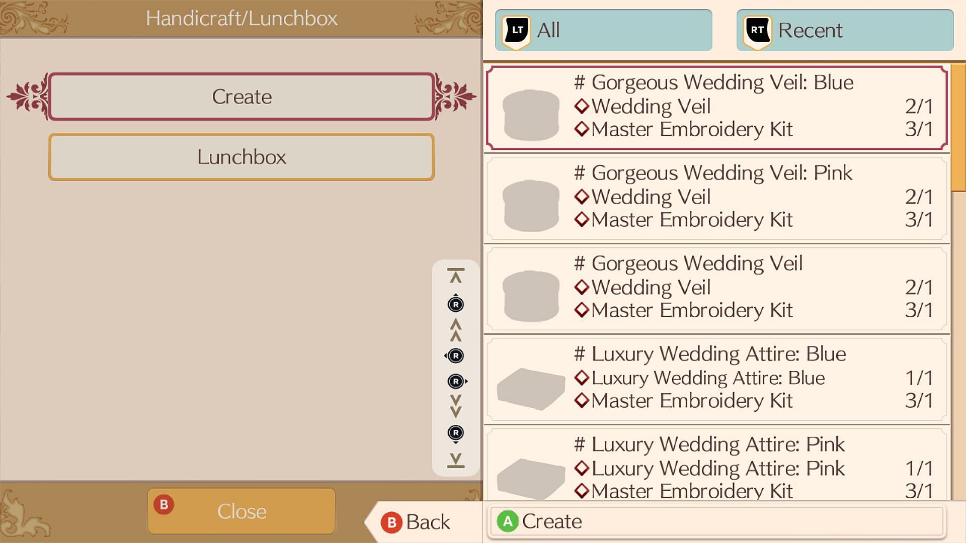 Unlocks new Handcraft recipes that let you embroider detailed designs onto deluxe wedding outfits and veils.