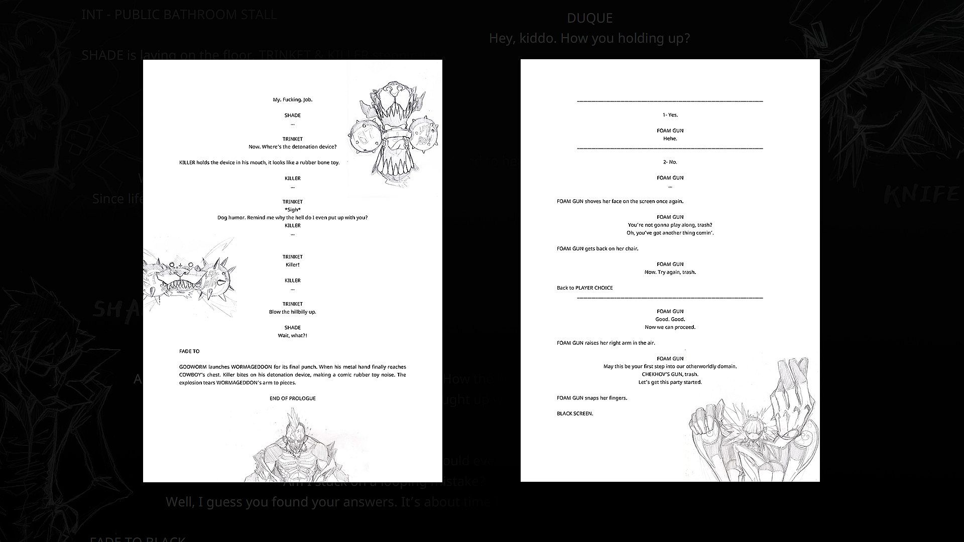 With a fully-voiced, multi-character script spanning hours, there are dozens of character evolutions and plot lines to enjoy in Wolfstride just by playing. However, fans of the game and narrative enthusiasts can dig even deeper by reading a pre-VO script to see how the process of recording the voices and polishing the story changed the game and its narrative arc over time. Throughout the script, players and readers can also find pencil sketches from early development, offering an inside look at how visual and narrative concepts come together to ultimately form a compelling and interactive story. And if you still can't get enough, this DLC also includes high-res wallpapers so you can enjoy Wolfstride's gorgeous art day in and day out.