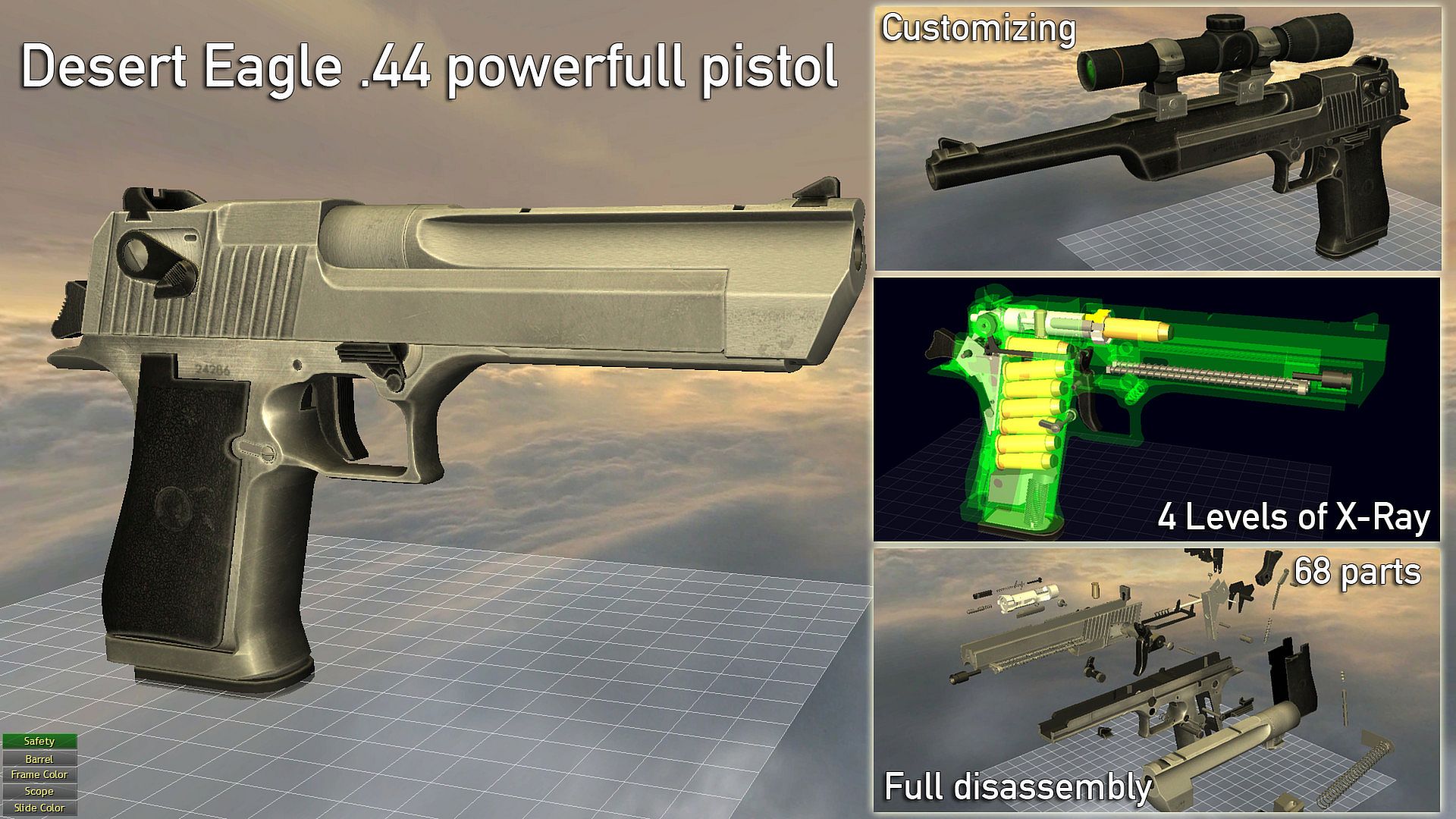 Also you may explore gun functionality with fire, reload and unload animations with slowdown and X-Ray support.