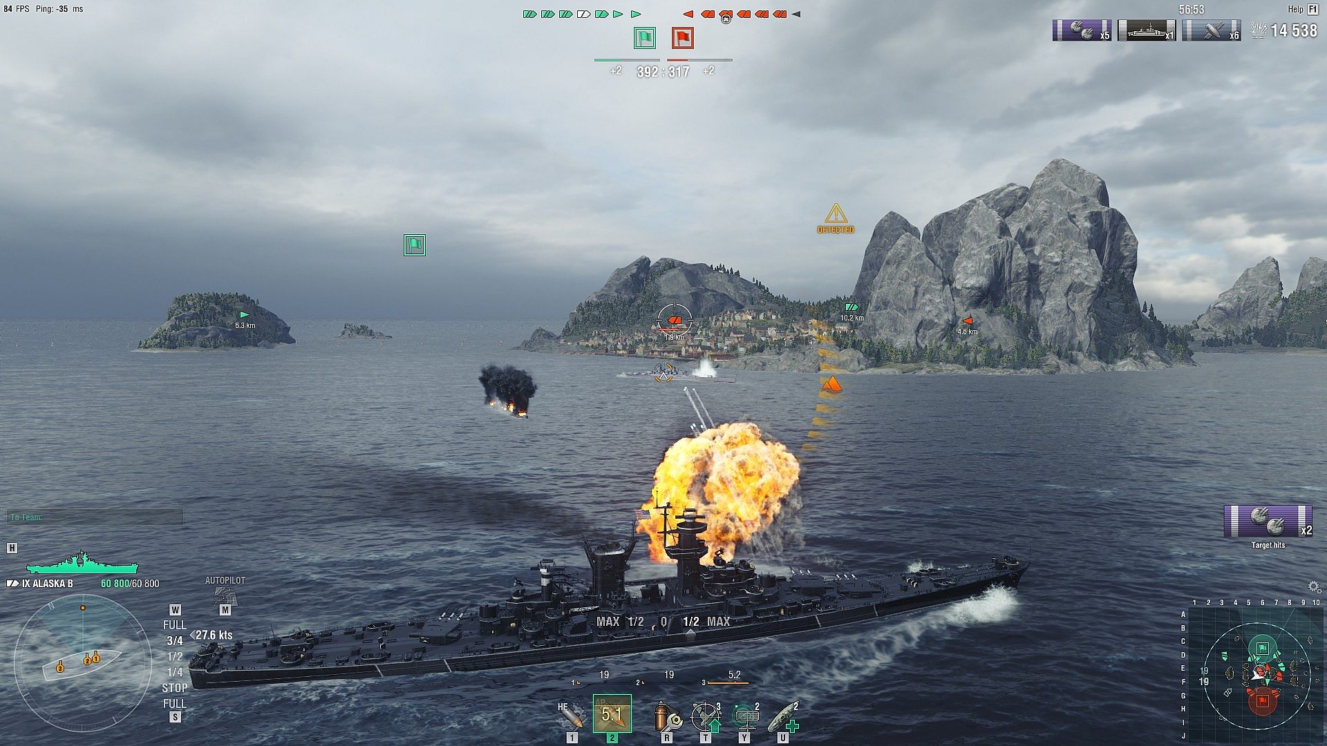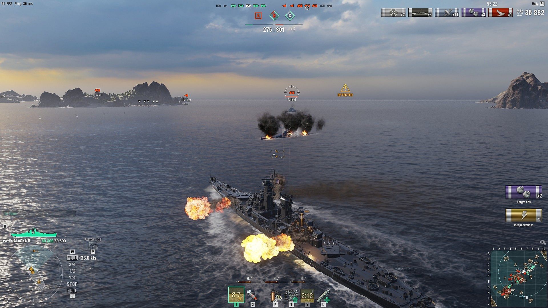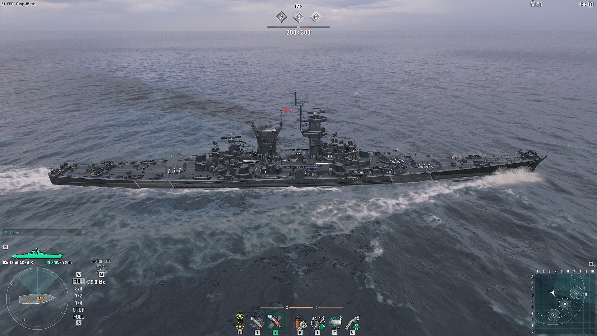 She resides at Tier IX in the game. The ship has large dimensions, boasts an extensive pool of HP, carries powerful 305 mm artillery, and is equipped with a diverse set of consumables. Alaska excels at destroying cruisers at mid-range distances.