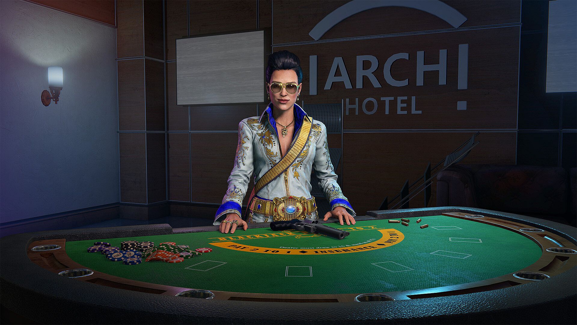 Deck your gear out in pure Sin City fashion with the Vegas skin pack! Featuring a glamorous Vegas outfit for Sara Benedict, along with 4 dazzling weapon skins, one for each weapon: