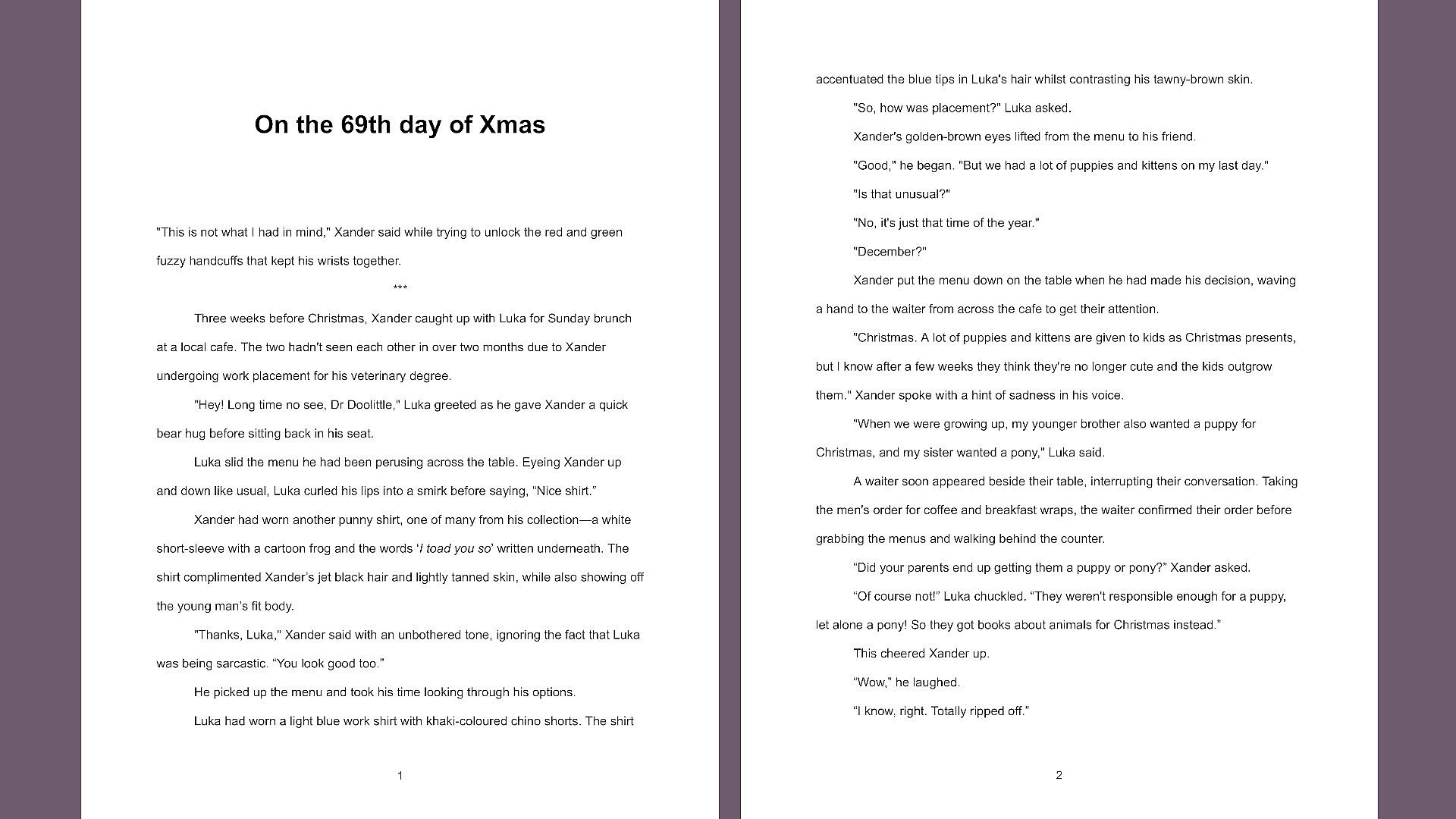 On the 69th day of Xmas is a short and sweet, erotic ebook that continues from the Fuck Buddies and/or Friends with Benefits endings of the visual novel game, Wrong Number. It follows Luka and Xander's first Christmas together after the events of the game.
