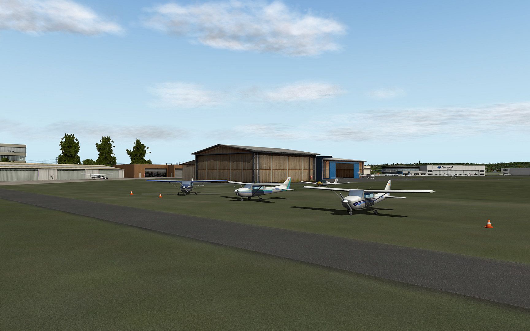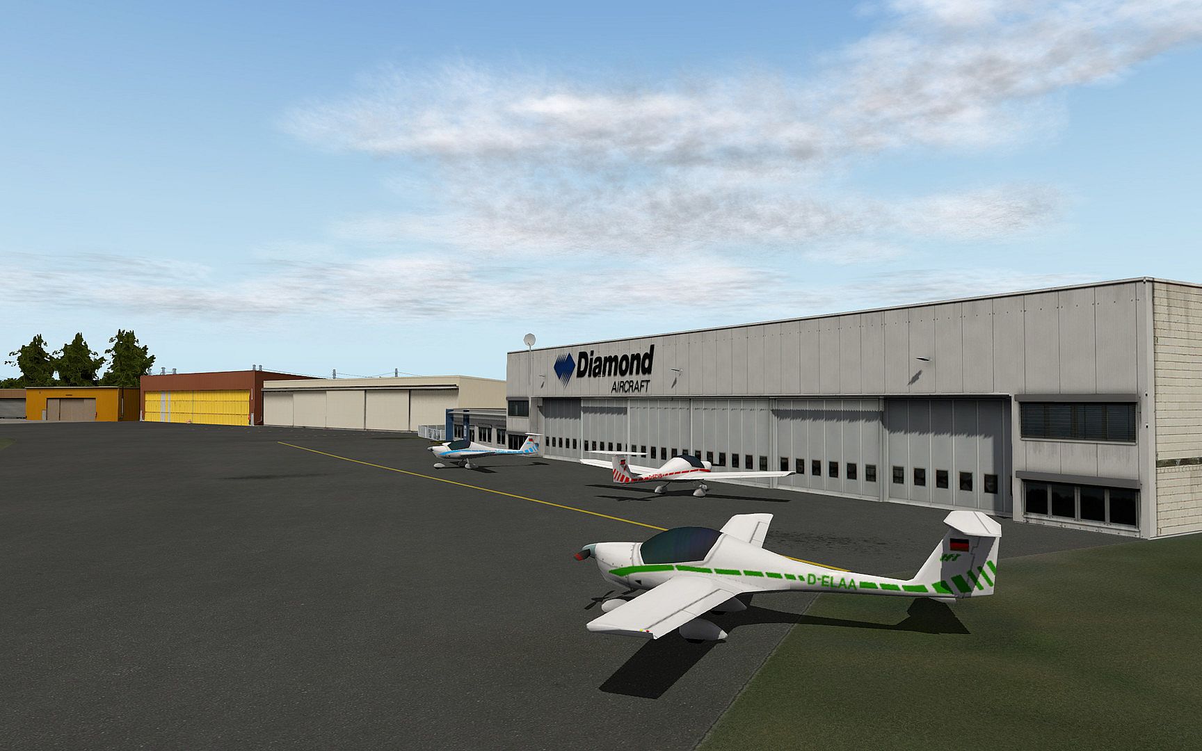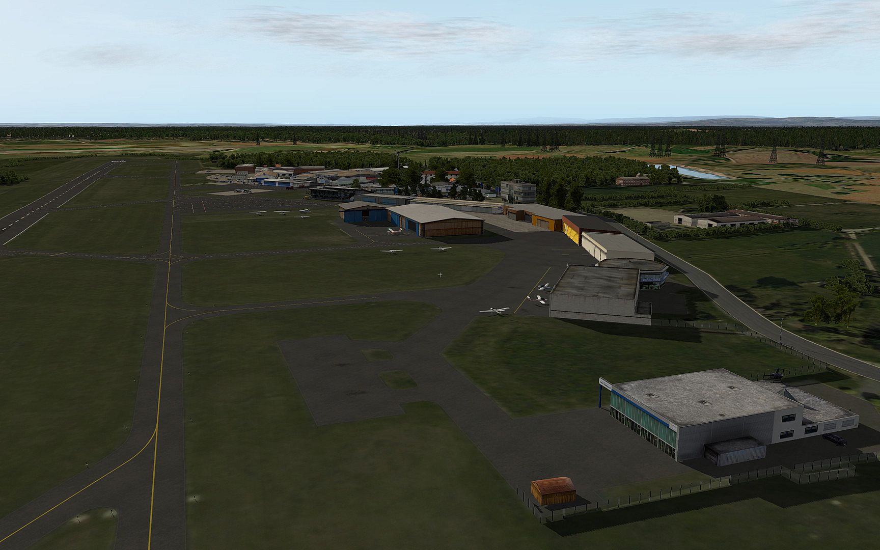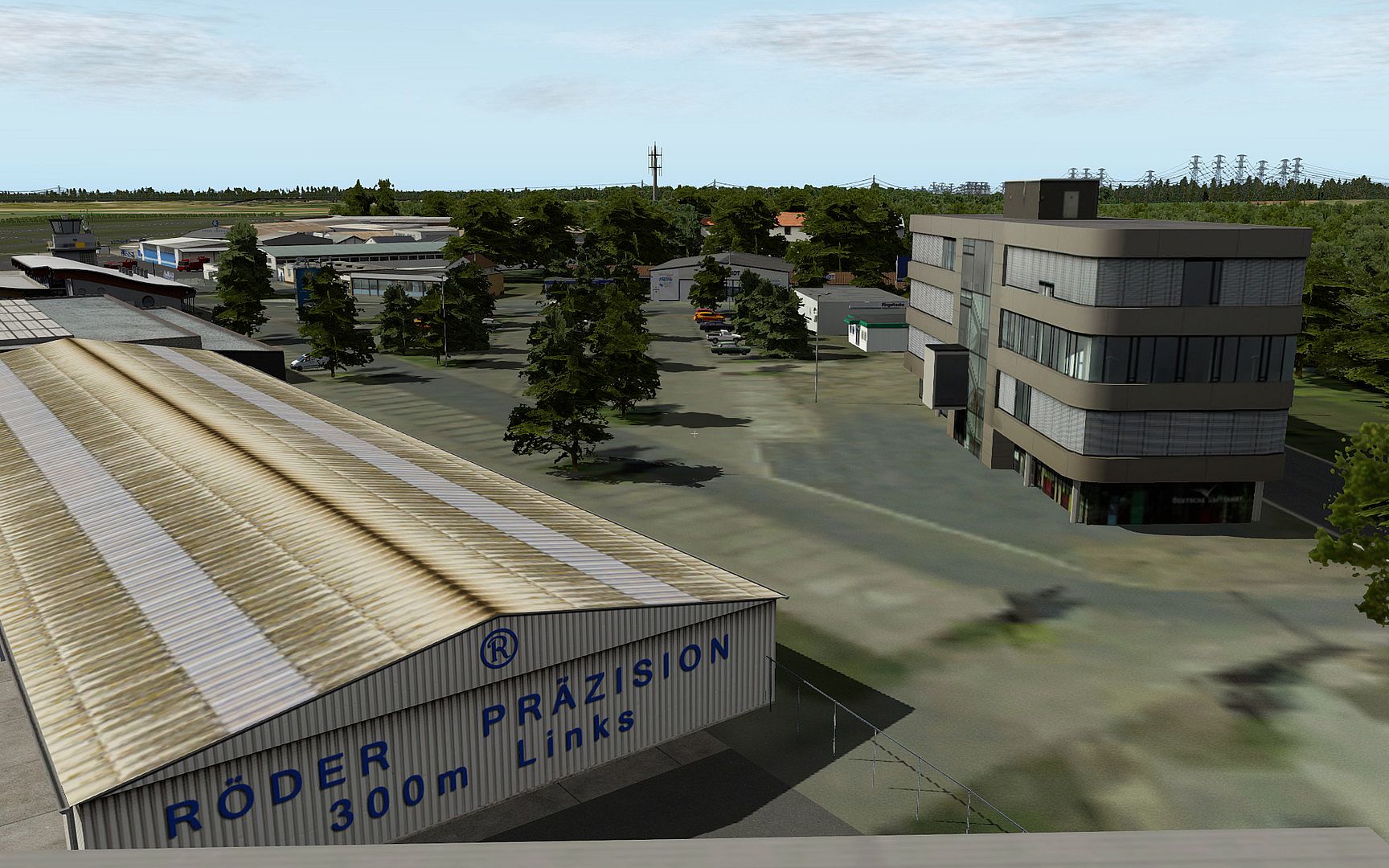 In combination with the photo realistic textures of the buildings and vehicles and a 0.5m/pixel ground texture resolution, the scenery Frankfurt-Egelsbach looks very authentic. The taxiway and runway displays are built according to the original plans. With its high-resolution day and night textures, the animated wind display on the tower and several other animations like hangar doors and the fire brigade the airport feels virtually aroused.