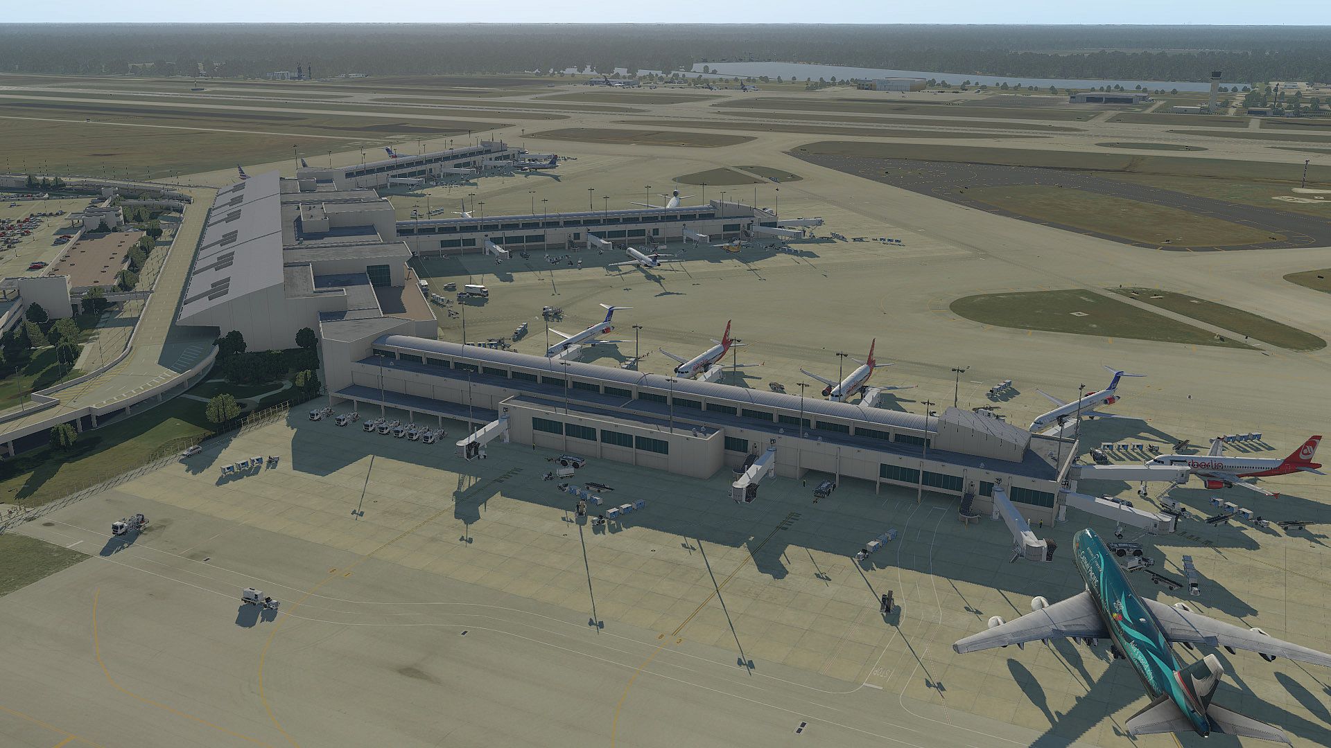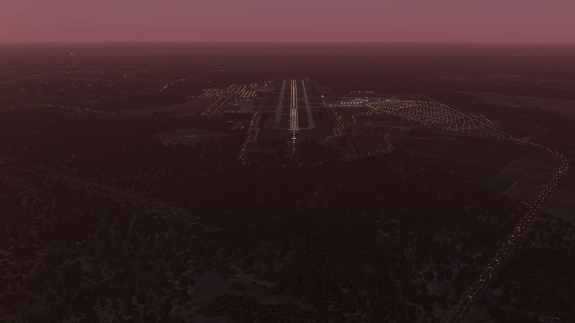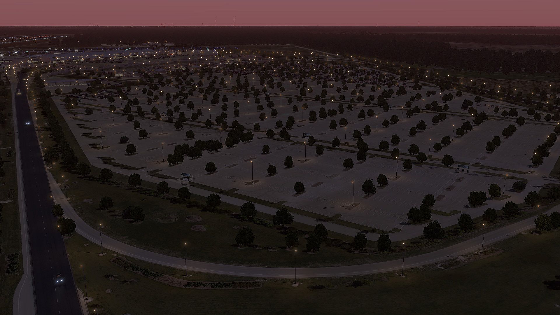 • Baked-in, ray-traced night illumination on the airport terminal building