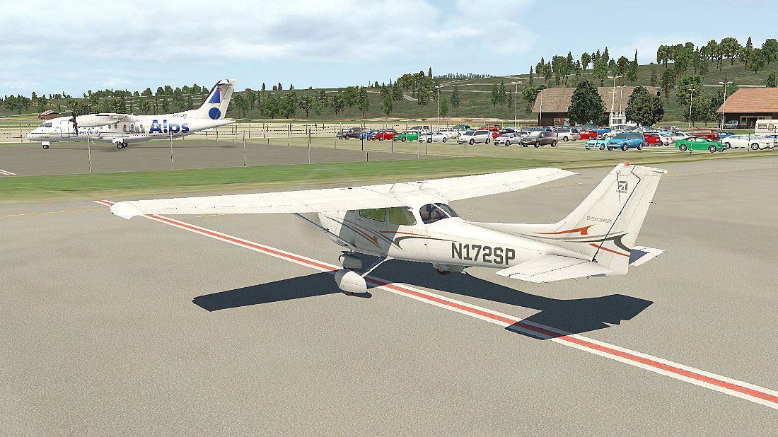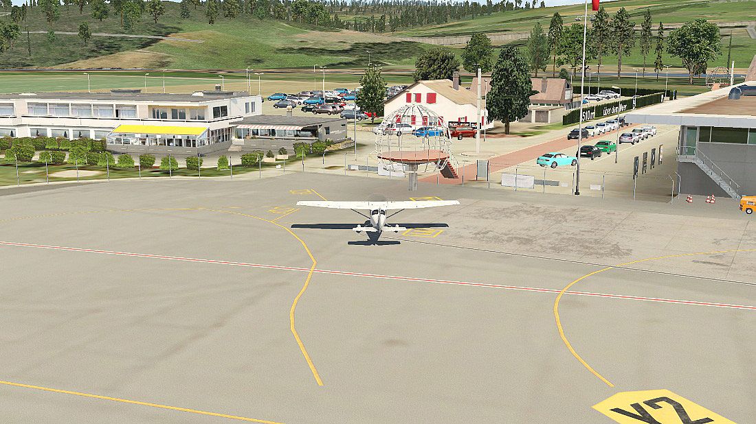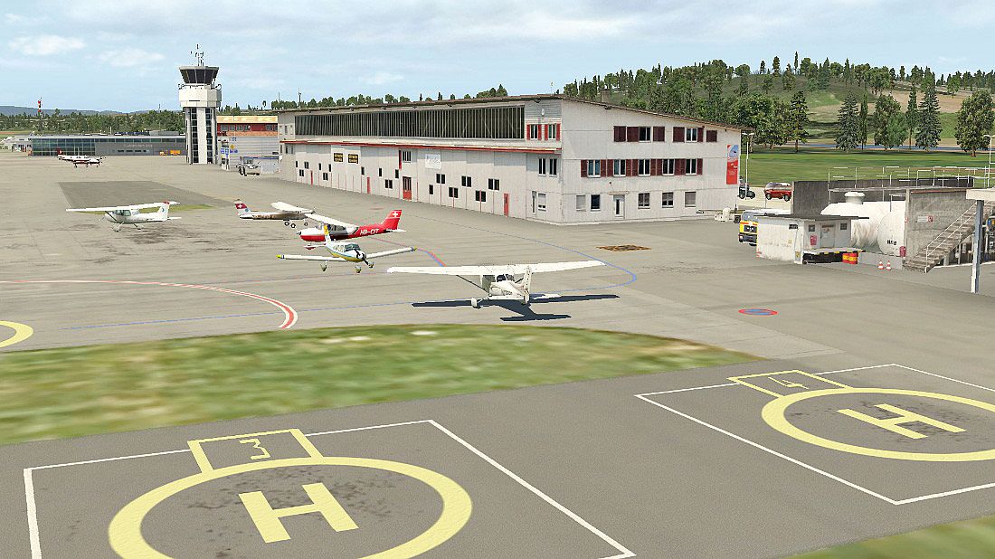 A special feature was also placed on the wider environment. The Bernese farmhouses, the large glider airfield and the industrial buildings can be seen prominently on the southern approach. Numerous static and dynamic objects ensure the typical flair of an airport.