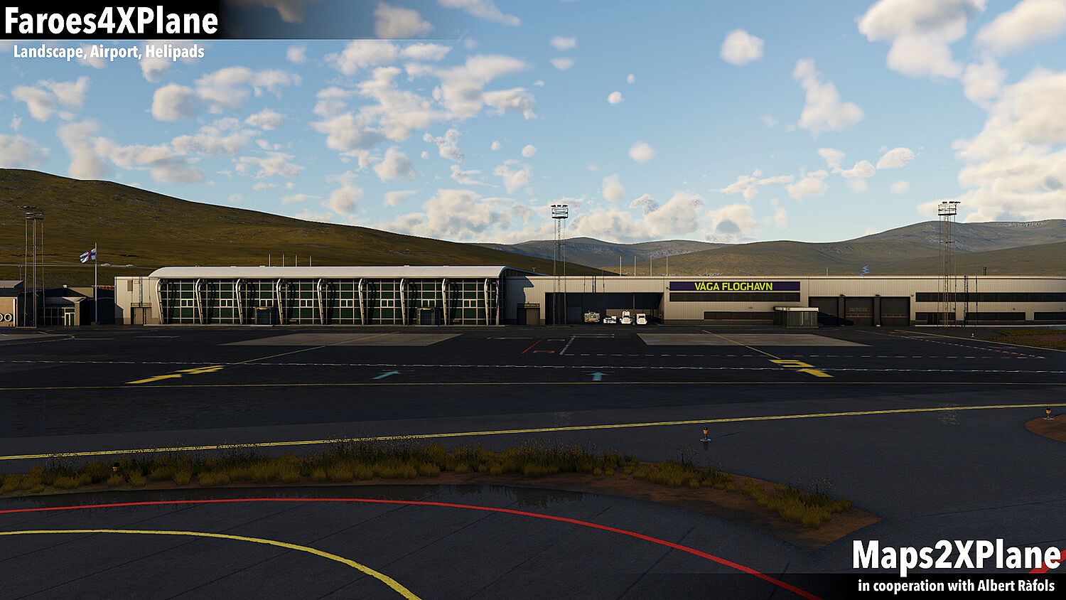 Virtual pilots can approach Vágar Airport (FAE, EKVG) that mirrors its real-world counterpart to great detail – like the runway that is realistically sloped. The eight helipads spread over the islands are included in this scenery as well.