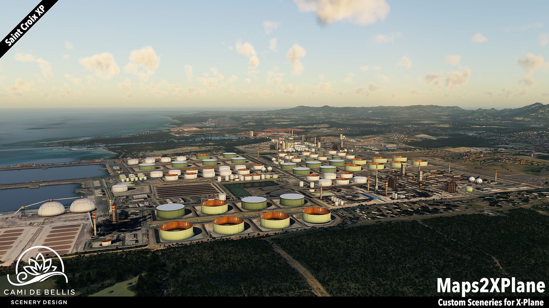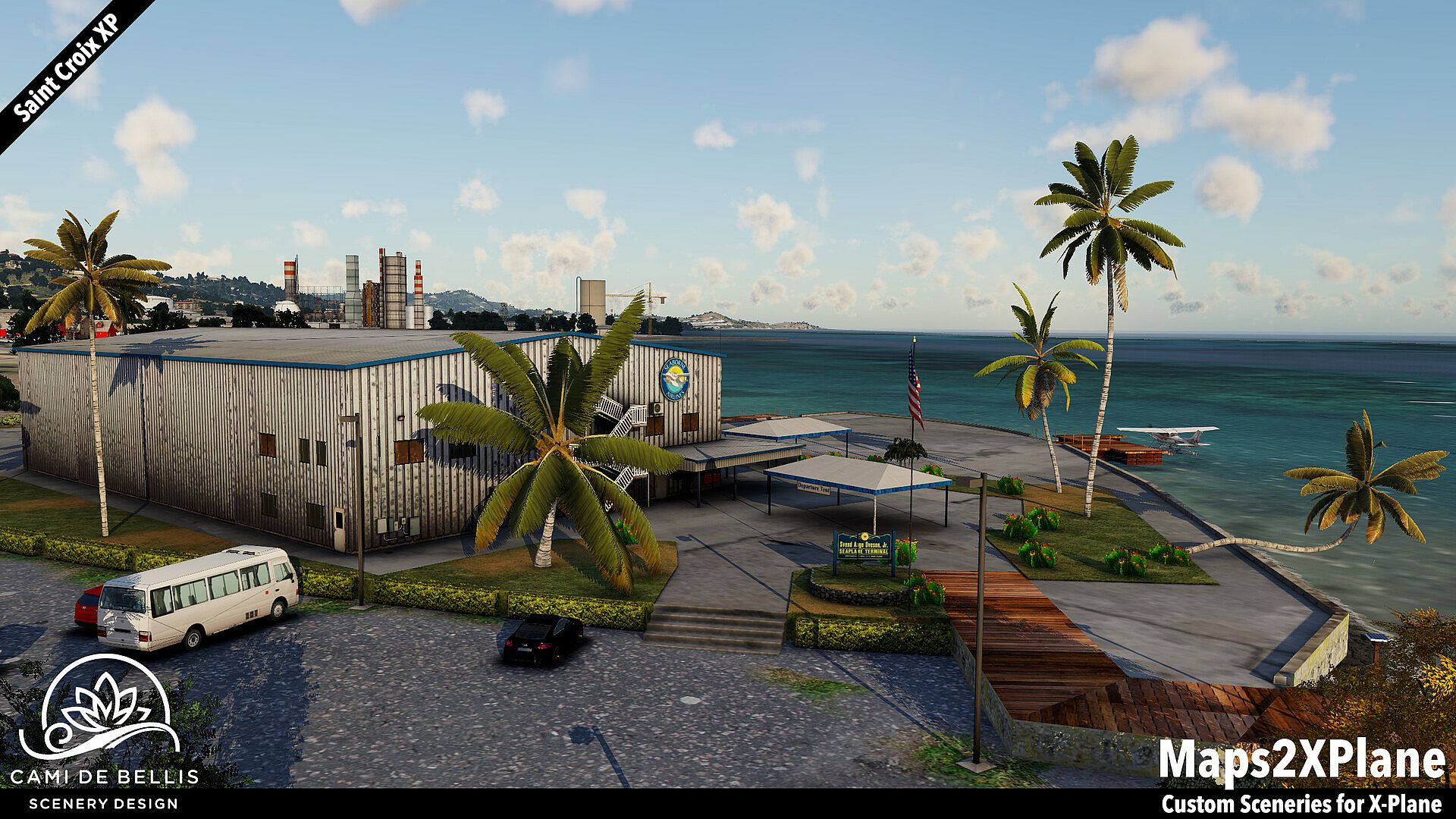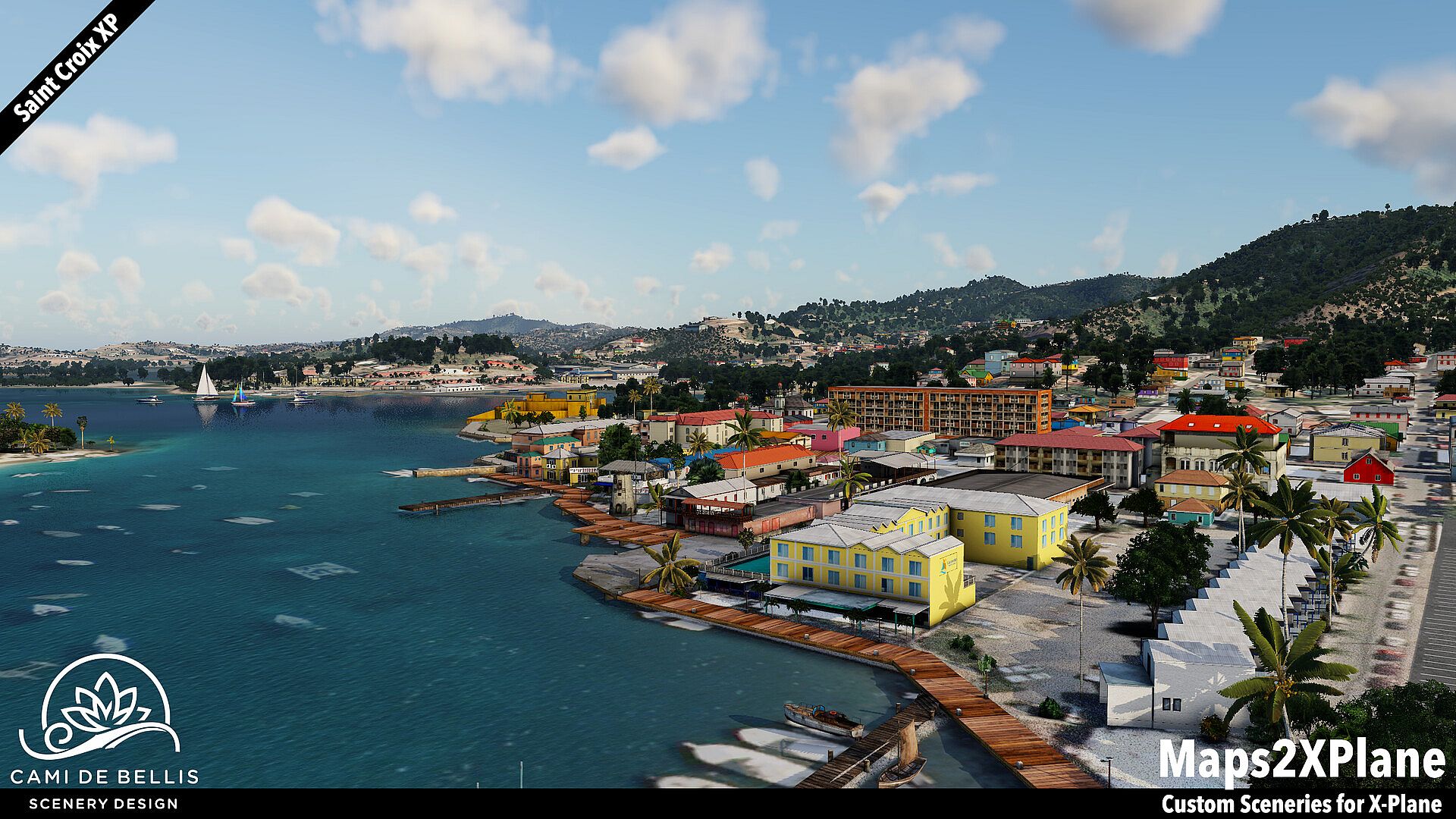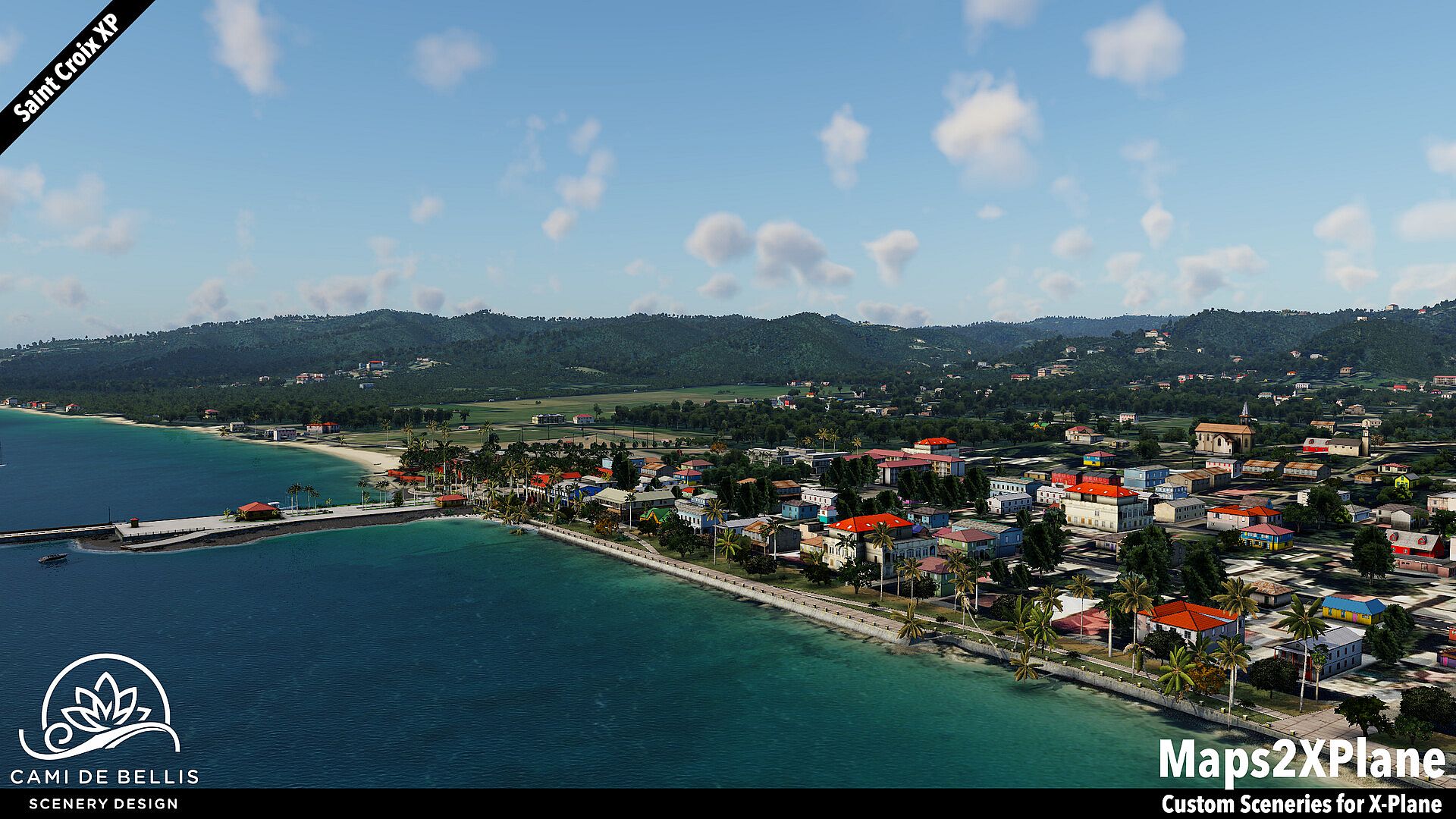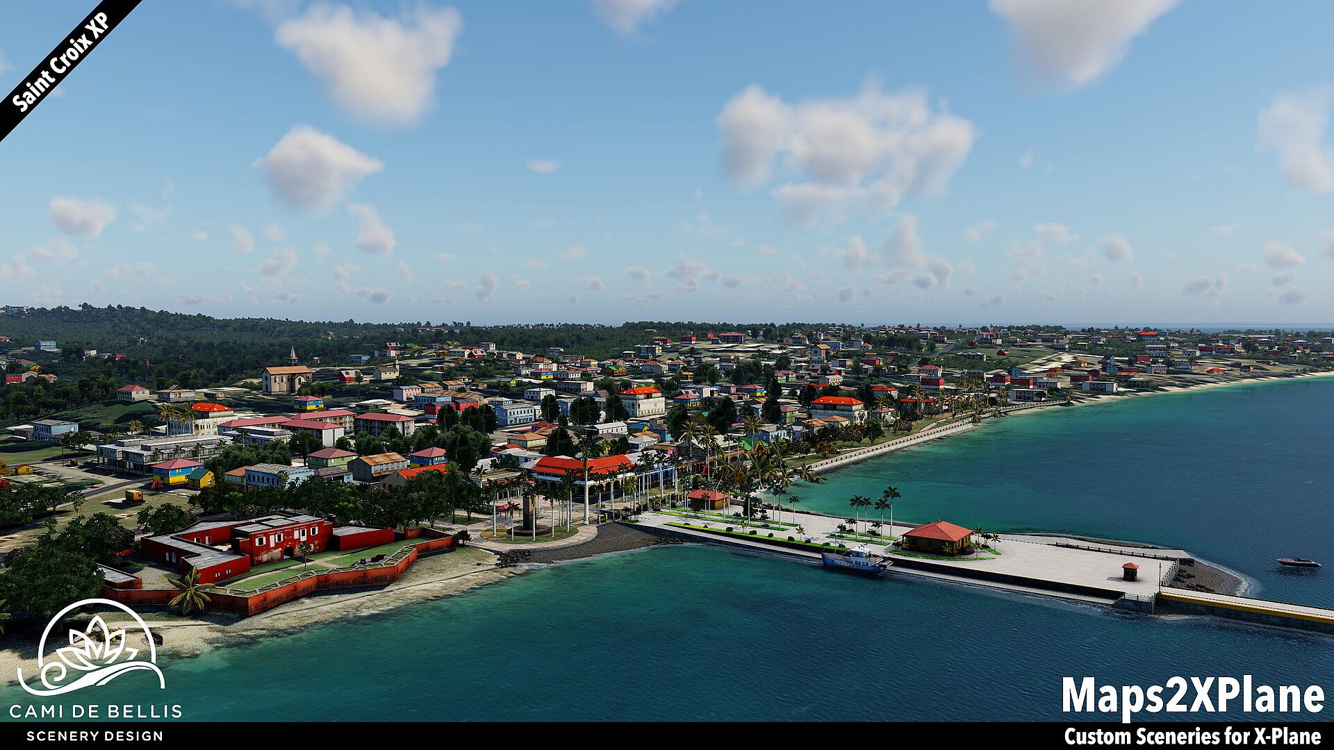 This scenery package for X-Plane features a custom photo-terrain-mesh for the entire island and surrounding islets, with custom overlays (vegetation, road-network and sea-routes with dynamic traffic, autogen buildings) and a highly detailed rendition of the international Henry E. Rohlsen Airport. Renditions of Christiansted and Frederiksted, featuring selected landmarks and including the Seaplane Base, complement the immersive scenery.