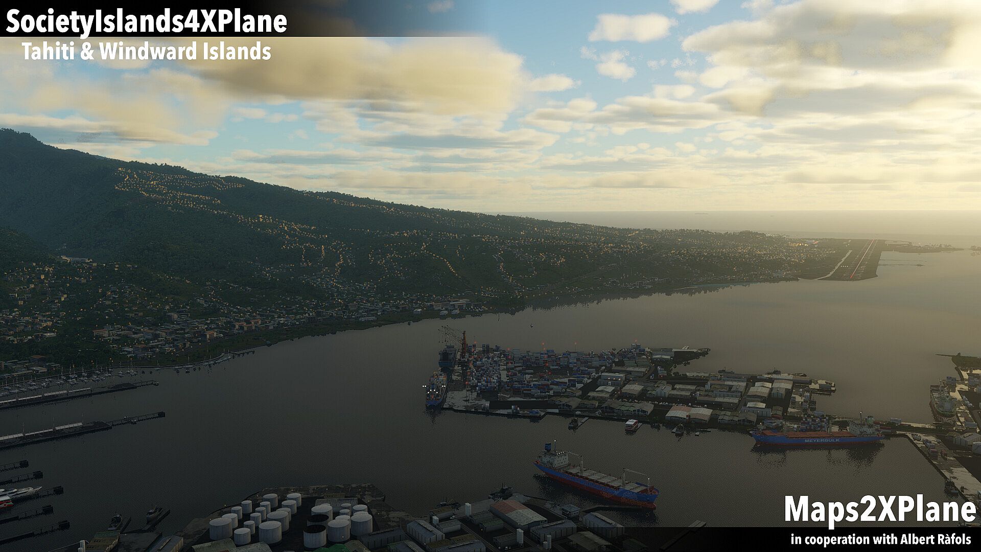 This scenery package for X-Plane features a custom terrain mesh with photo-realistic textures, dense vegetation and country-typical autogen, as well as custom road-networks and sea-routes with dynamic traffic. Included are detailed renditions of the Faa'a International Airport and two regional airports (Moorea, Tetiaroa), as well as three challenging heliports (Taaone, Taravao, Afareaitu).