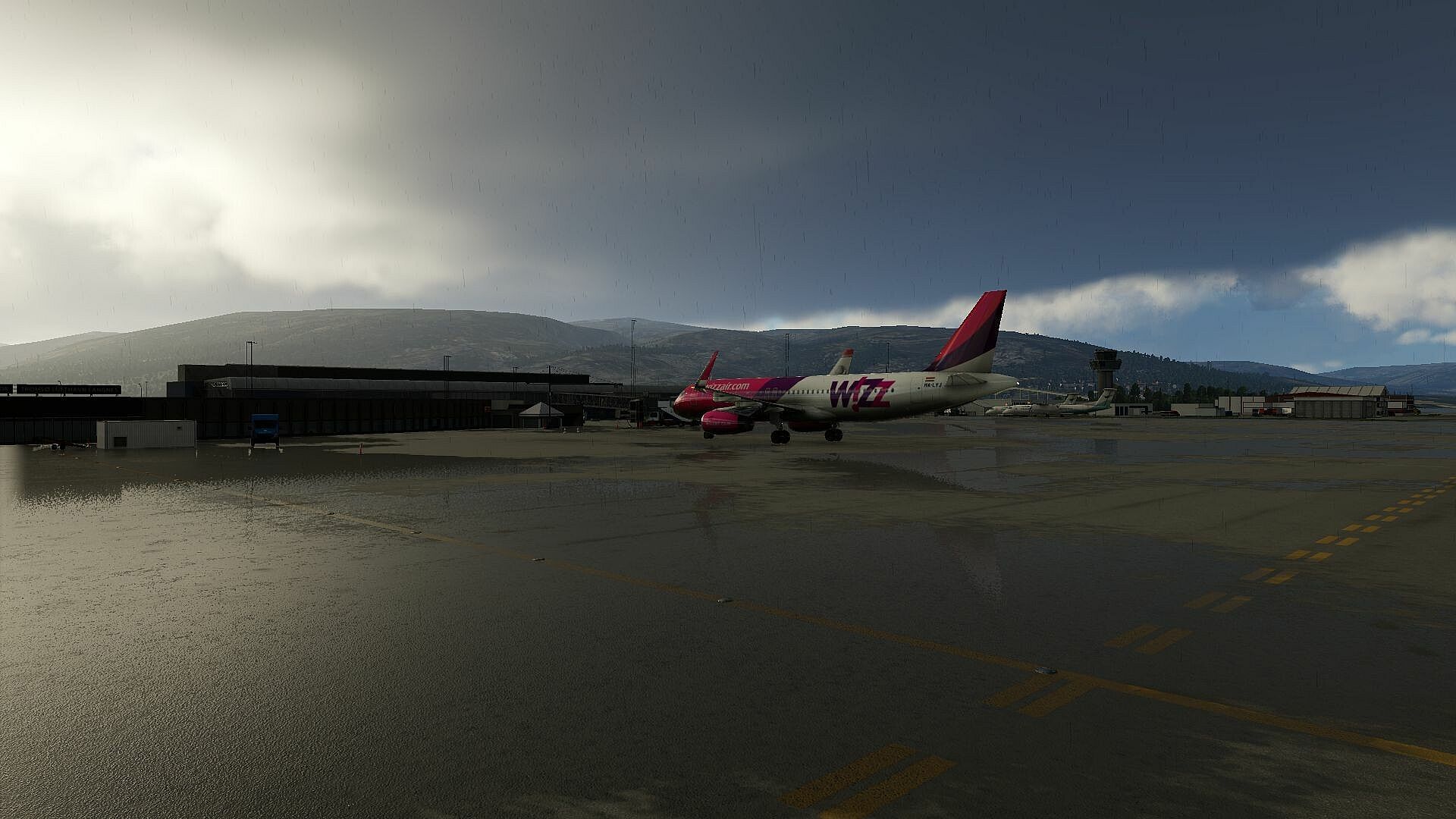 The total surface covered by the photo scenery stretches across an area of 121 km². The airport buildings come with high-resolution textures, and even the terminal interior has been recreated to high detail. Both the static aircraft at the airport and the buildings in the surroundings use custom models.