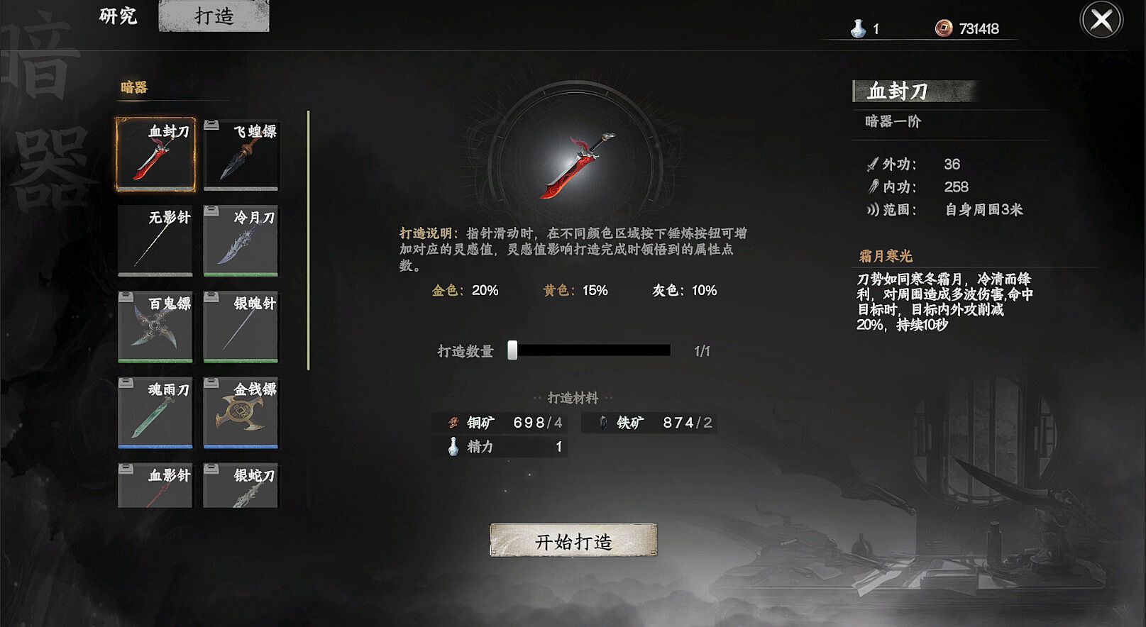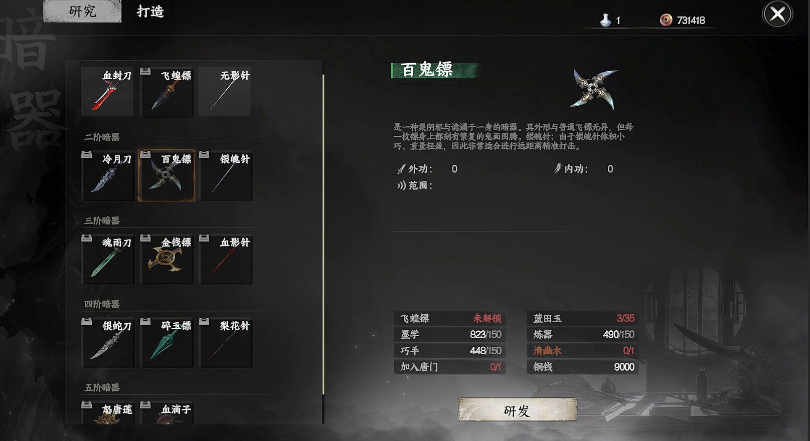 制作暗器,并能随着等级的提升不断升级暗器的等级,能够在战斗中使用暗器获得额外效果。