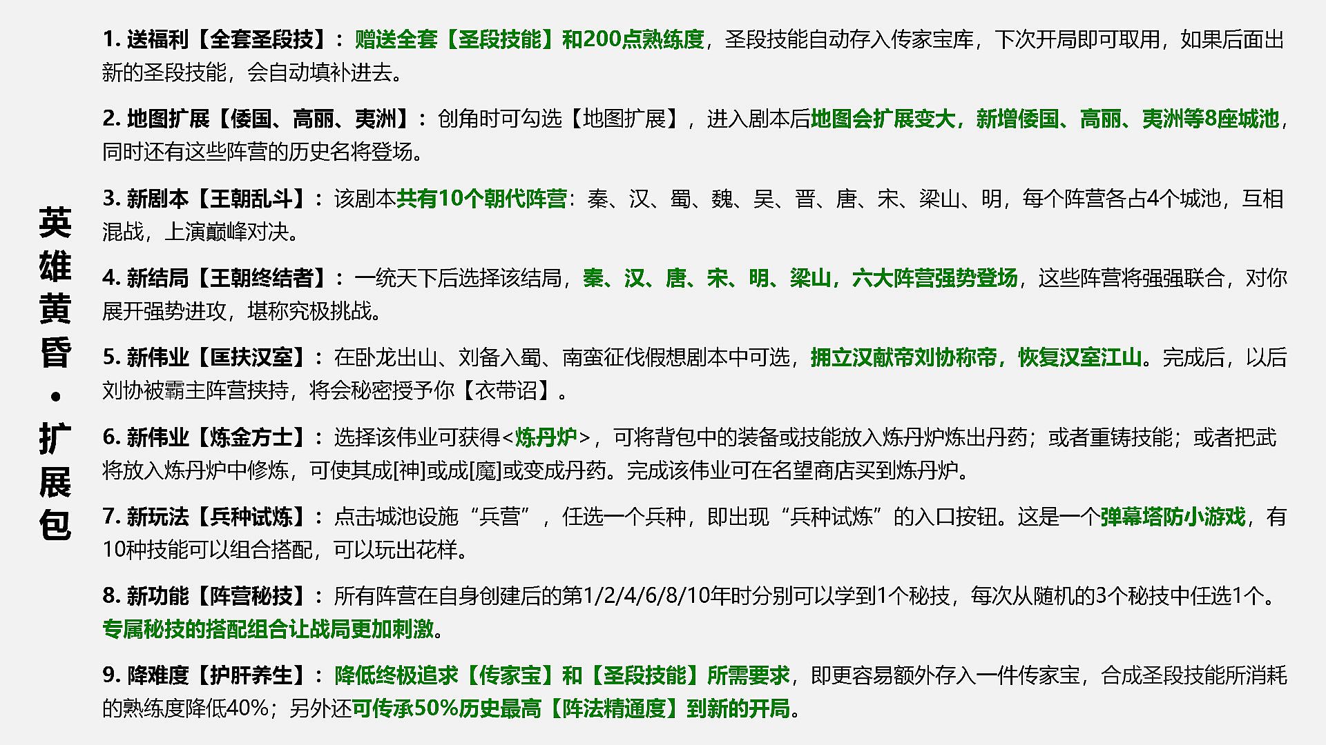 传家宝:一统天下时完成伟业时,只需4项(原需6项)功评项排首位,可额外再选择1件(共2件)装备或技能放入传家宝库,并累积1点传家宝运。