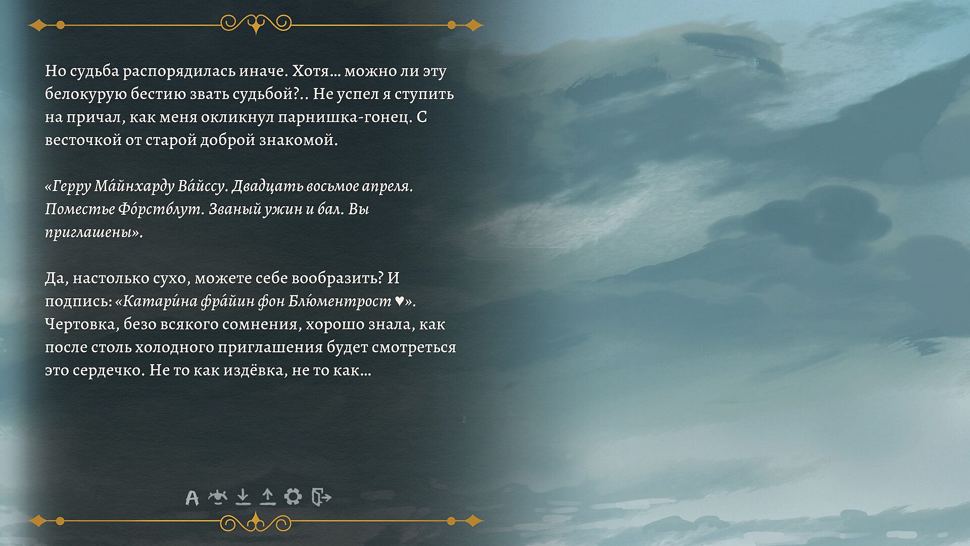 As soon as our hero left his ship, he received a message. But not a letter from the Order of the Hunters. No, a messenger gave Herr Weiss an invitation to a ball at the manor of Katharina Freiin von Blumentrost.
