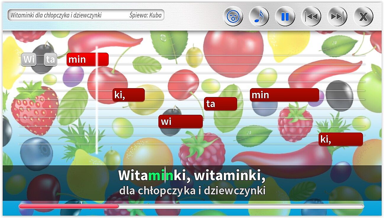 • Dodatkowe ścieżki wokalne pomagające śpiewać najmłodszym. Specjalnie dla dzieci jeszcze nieumiejących czytać, możliwość śpiewania z gotowym podkładem wokalnym.
