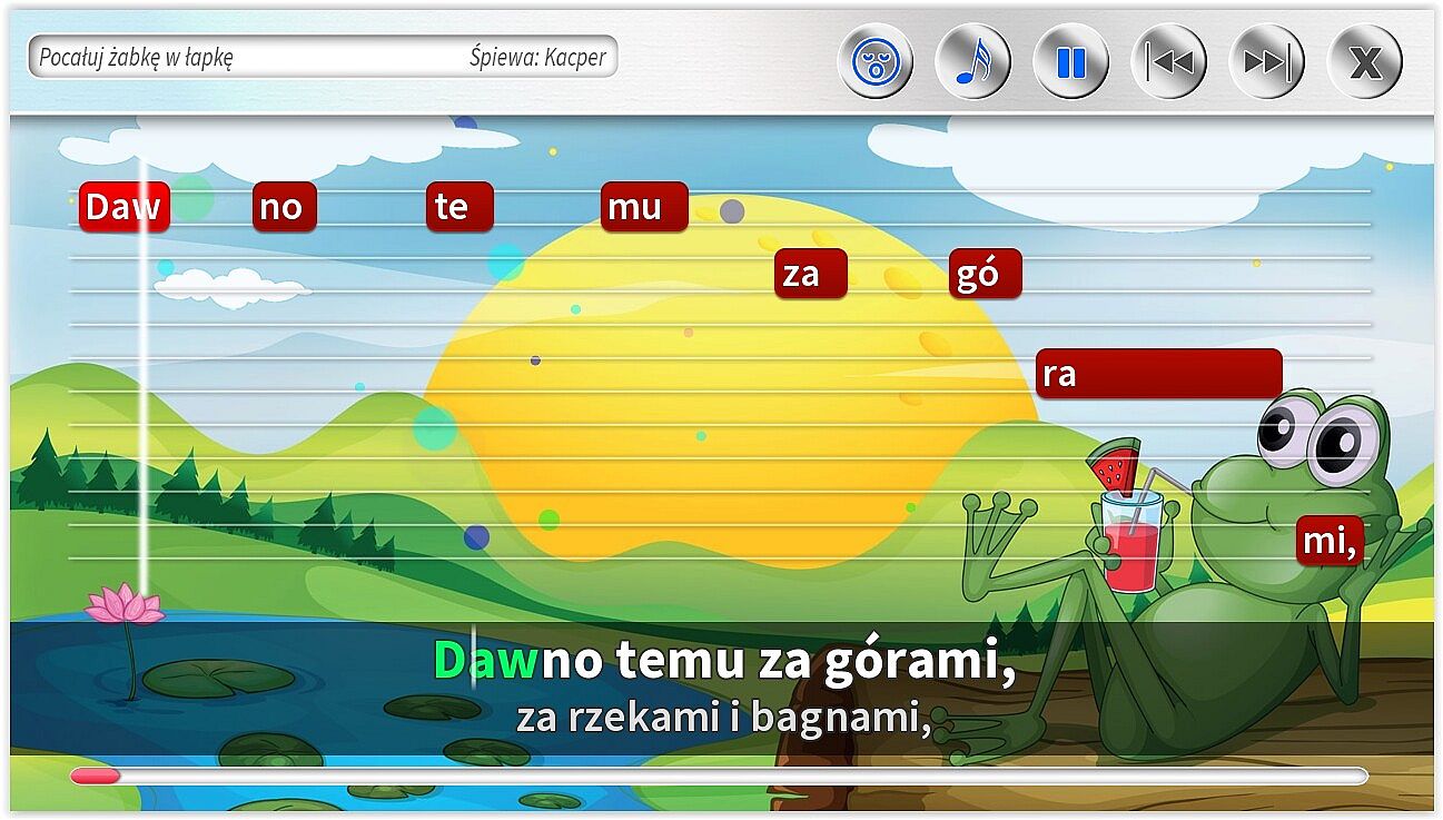 • Różne rodzaje podpowiedzi na ekranie, w tym: tekst piosenki, belki z tekstem, pasek czasu.