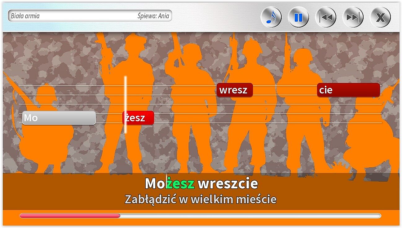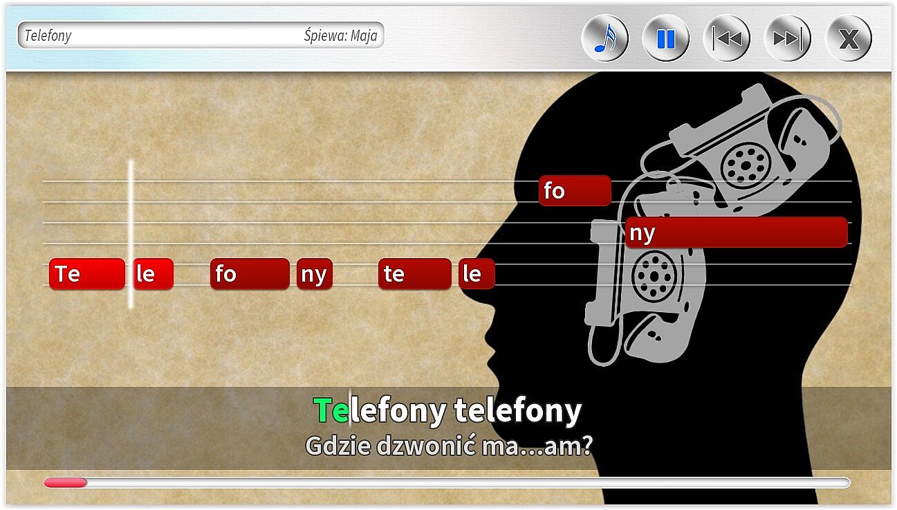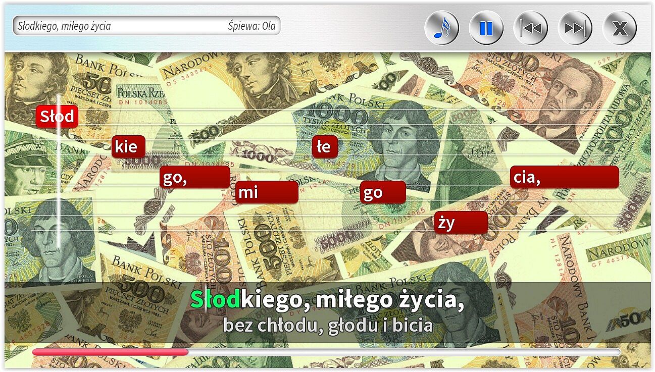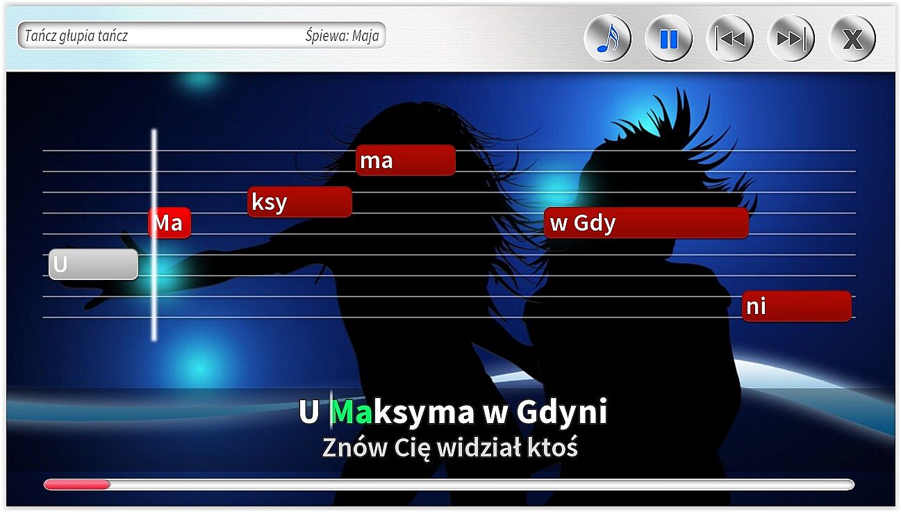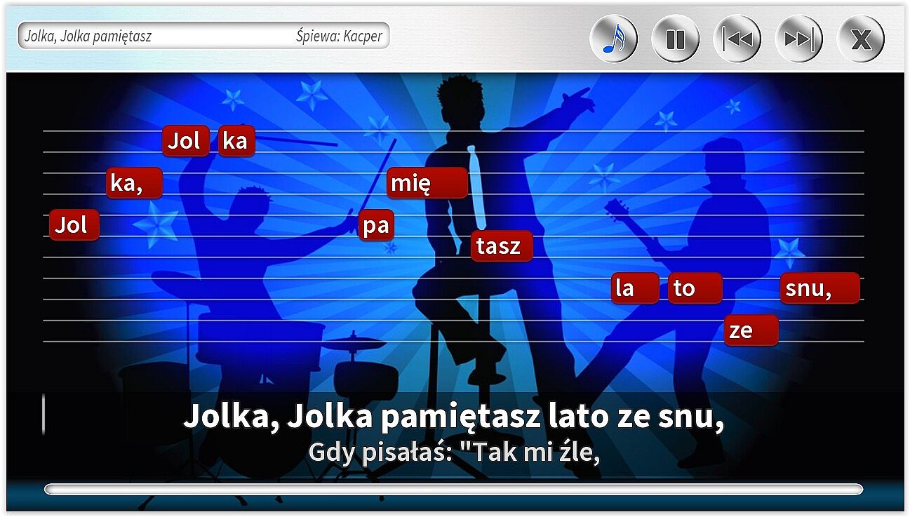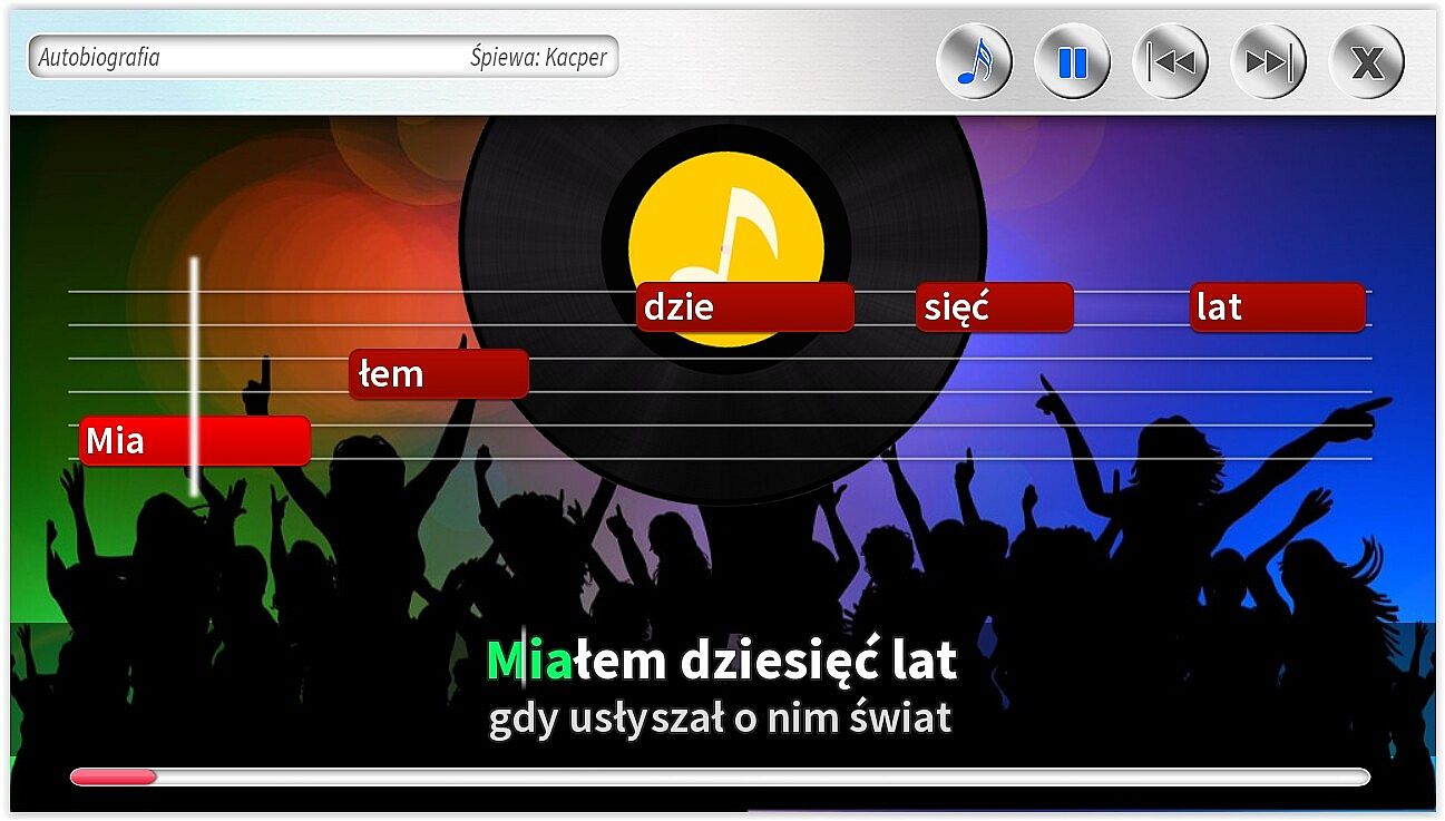 - Różne rodzaje podpowiedzi na ekranie, w tym: tekst piosenki, belki z tekstem, pasek czasu.