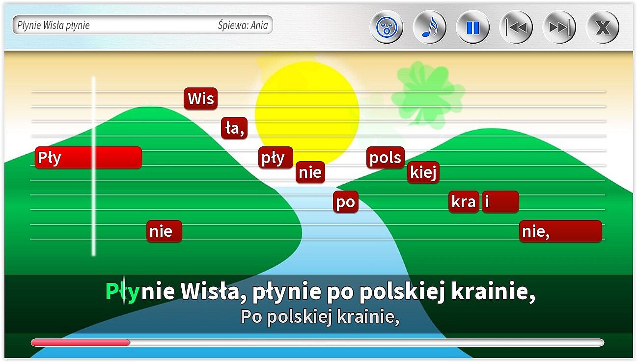 • Różne rodzaje podpowiedzi na ekranie, w tym: tekst piosenki, belki z tekstem, pasek czasu.