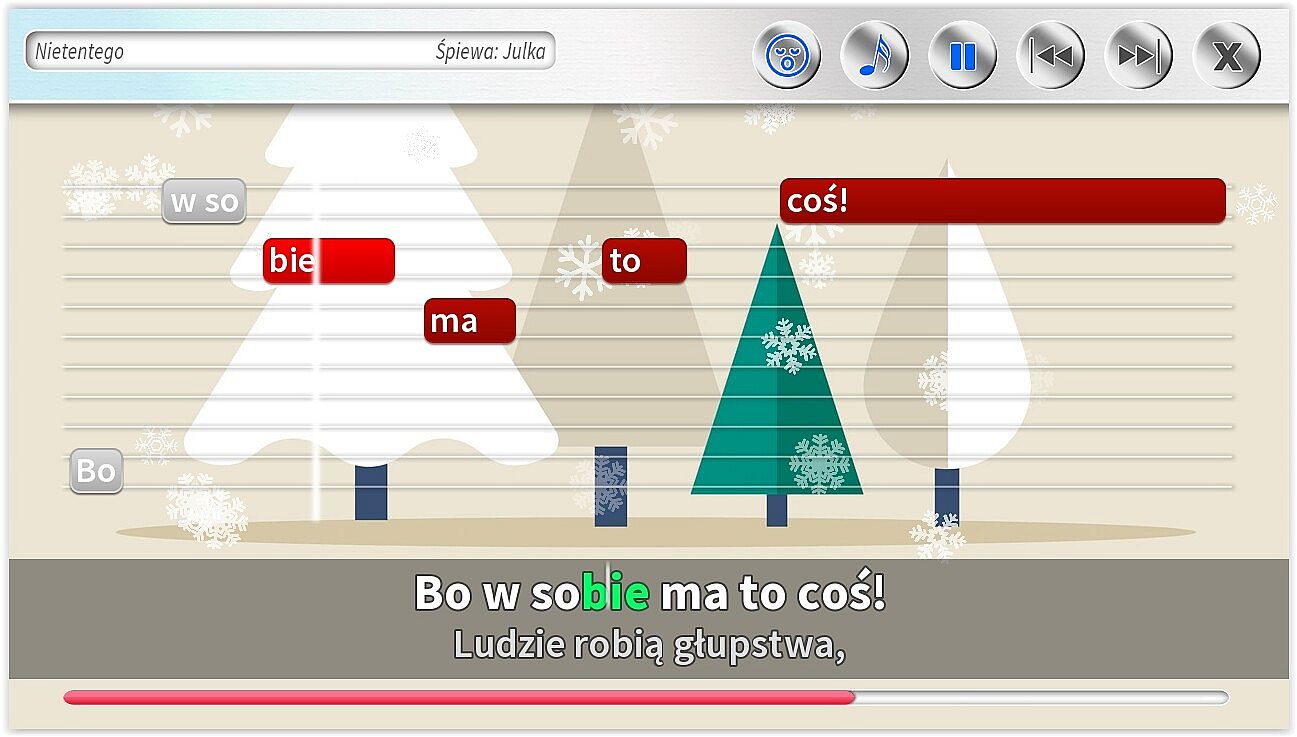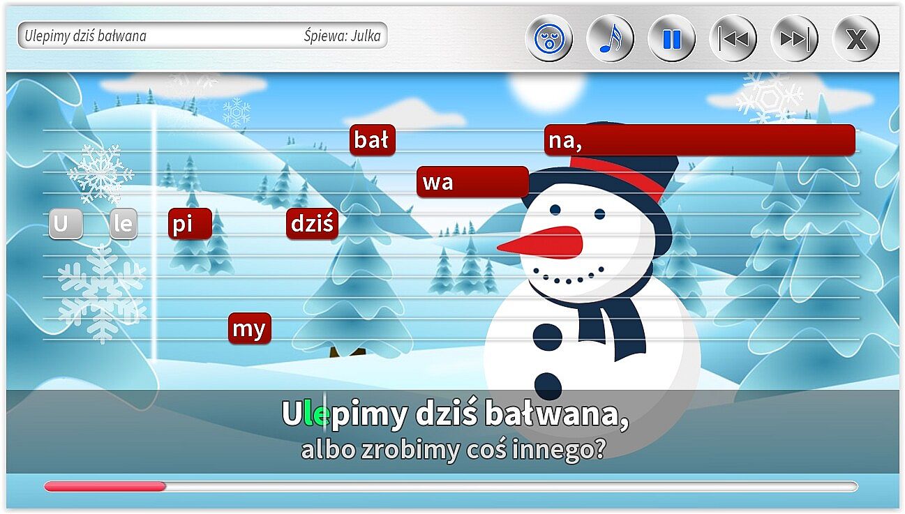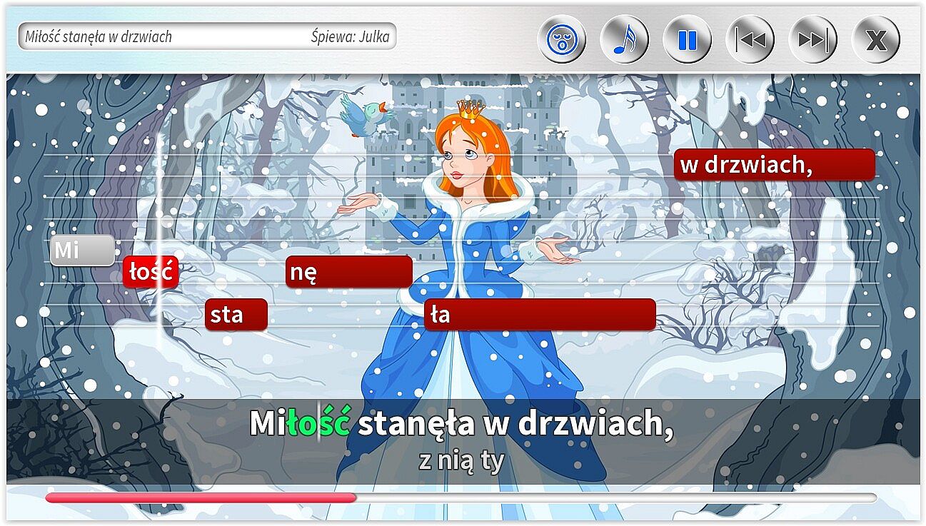 • Dodatkowe ścieżki wokalne pomagające śpiewać najmłodszym. Specjalnie dla dzieci jeszcze nieumiejących czytać, możliwość śpiewania z gotowym podkładem wokalnym.