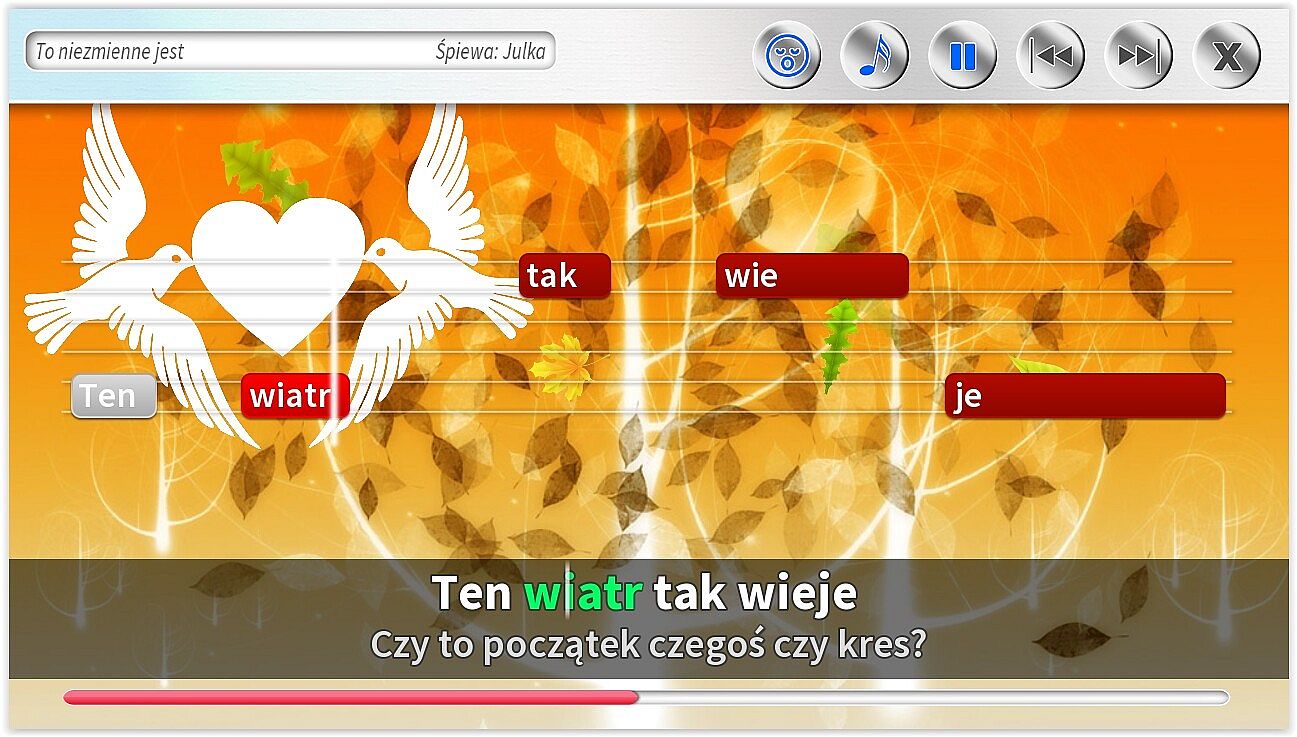 • Różne rodzaje podpowiedzi na ekranie, w tym: tekst piosenki, belki z tekstem, pasek czasu.