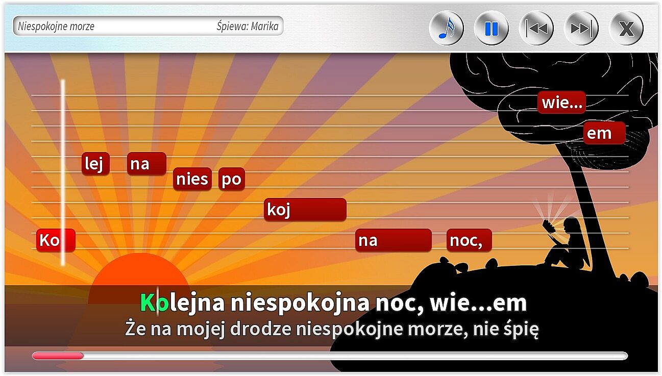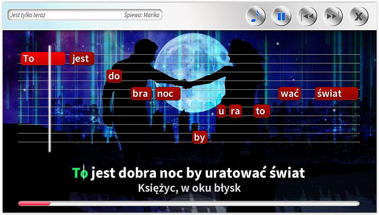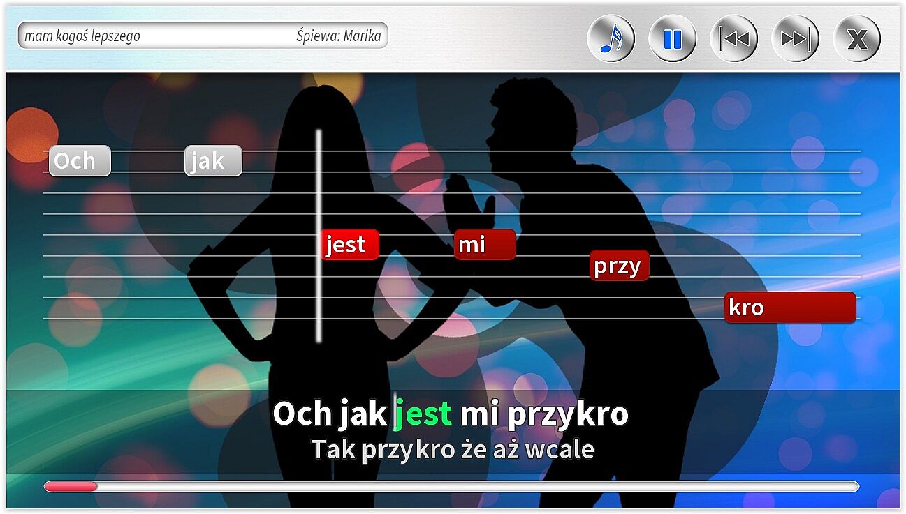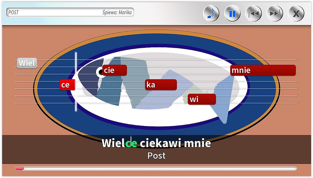 • Różne rodzaje podpowiedzi na ekranie, w tym: tekst piosenki, belki z tekstem, pasek czasu.