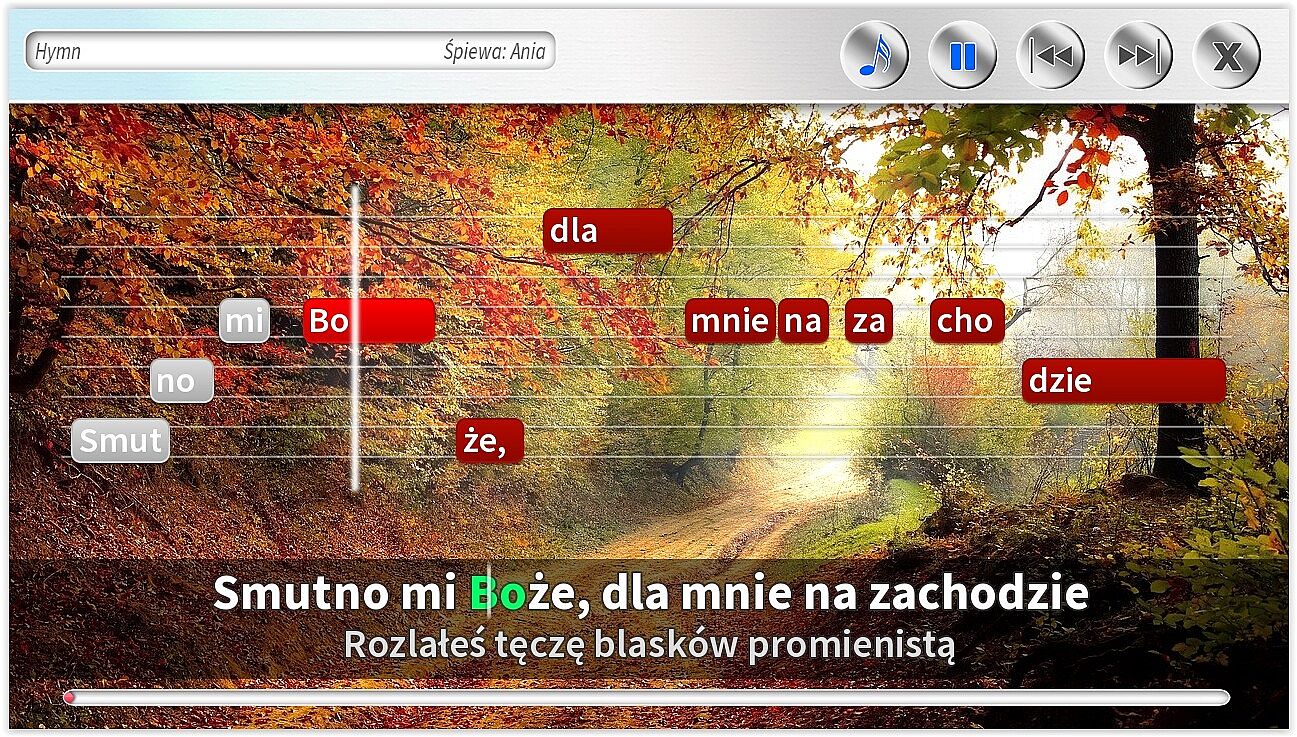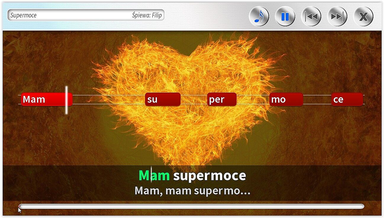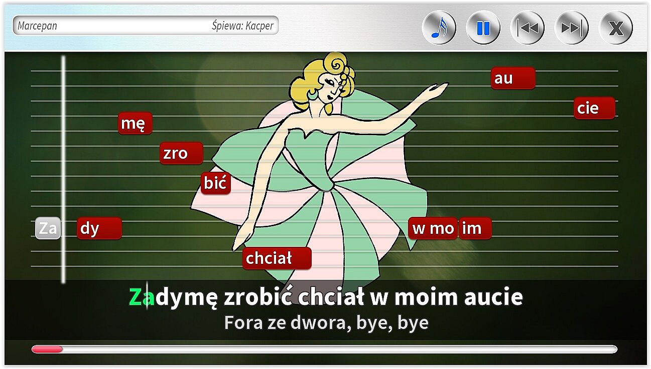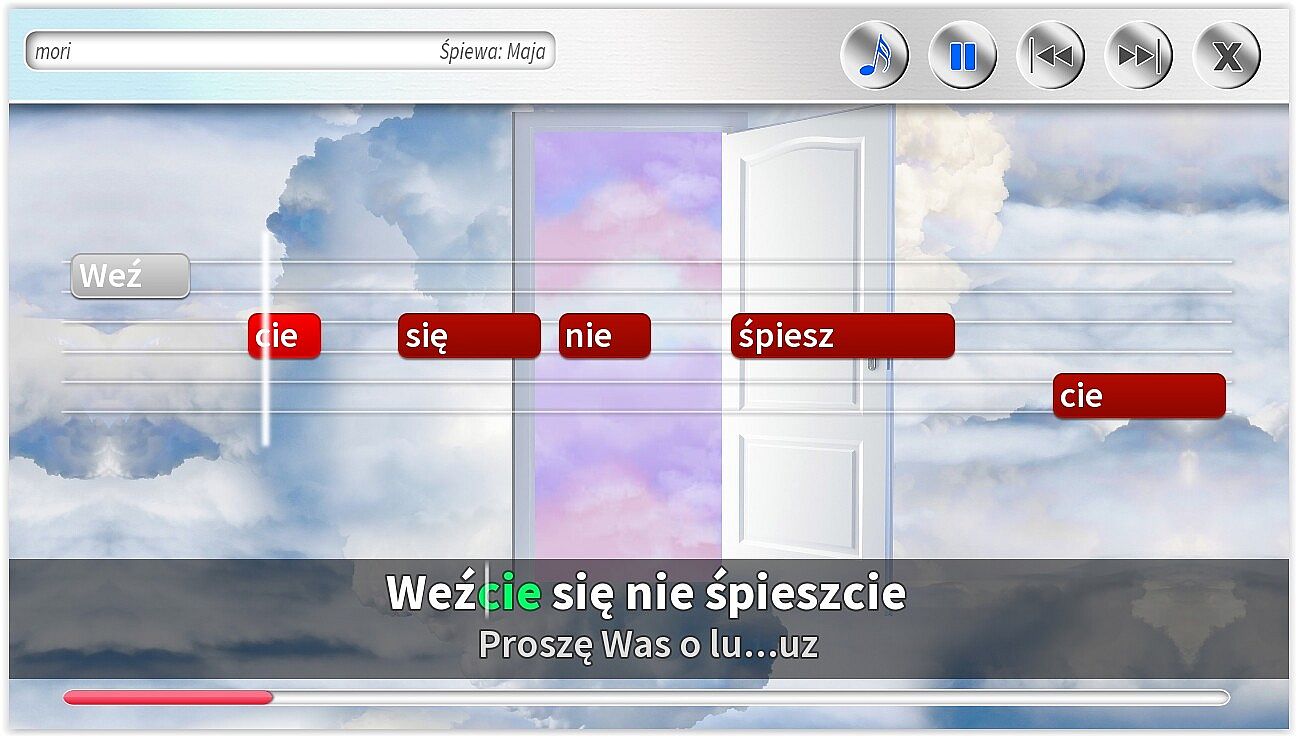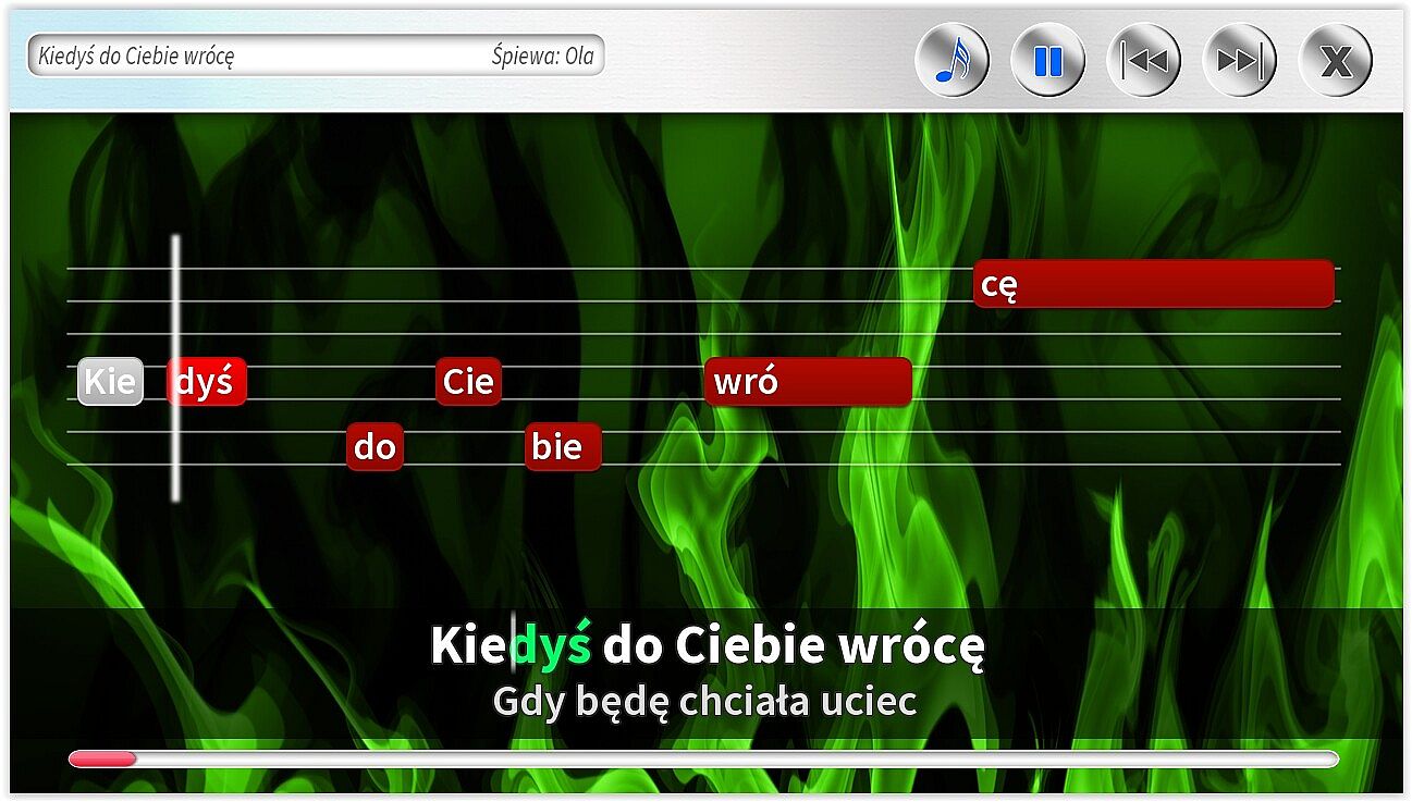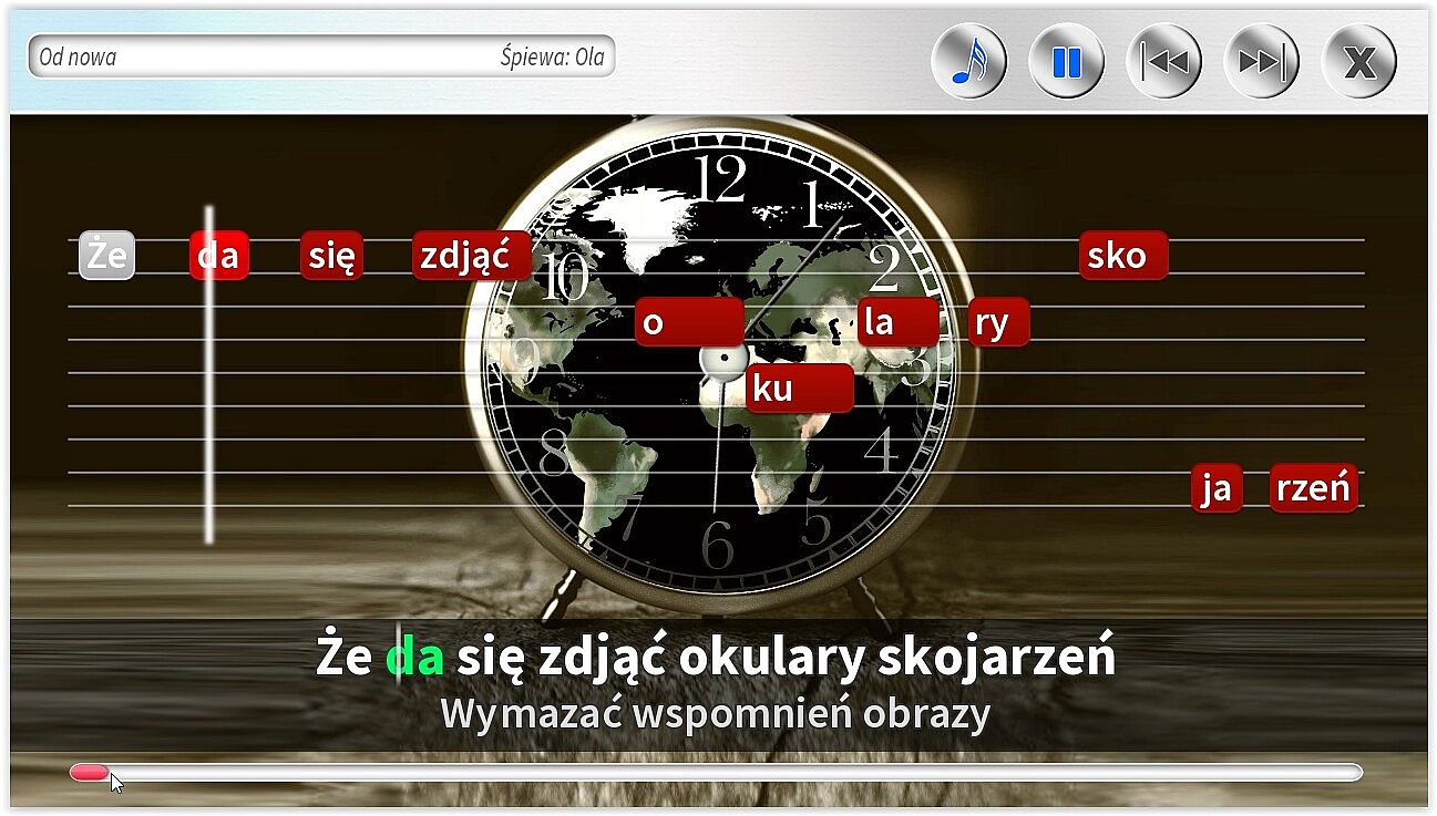 - Różne rodzaje podpowiedzi na ekranie, w tym: tekst piosenki, belki z tekstem, pasek czasu.