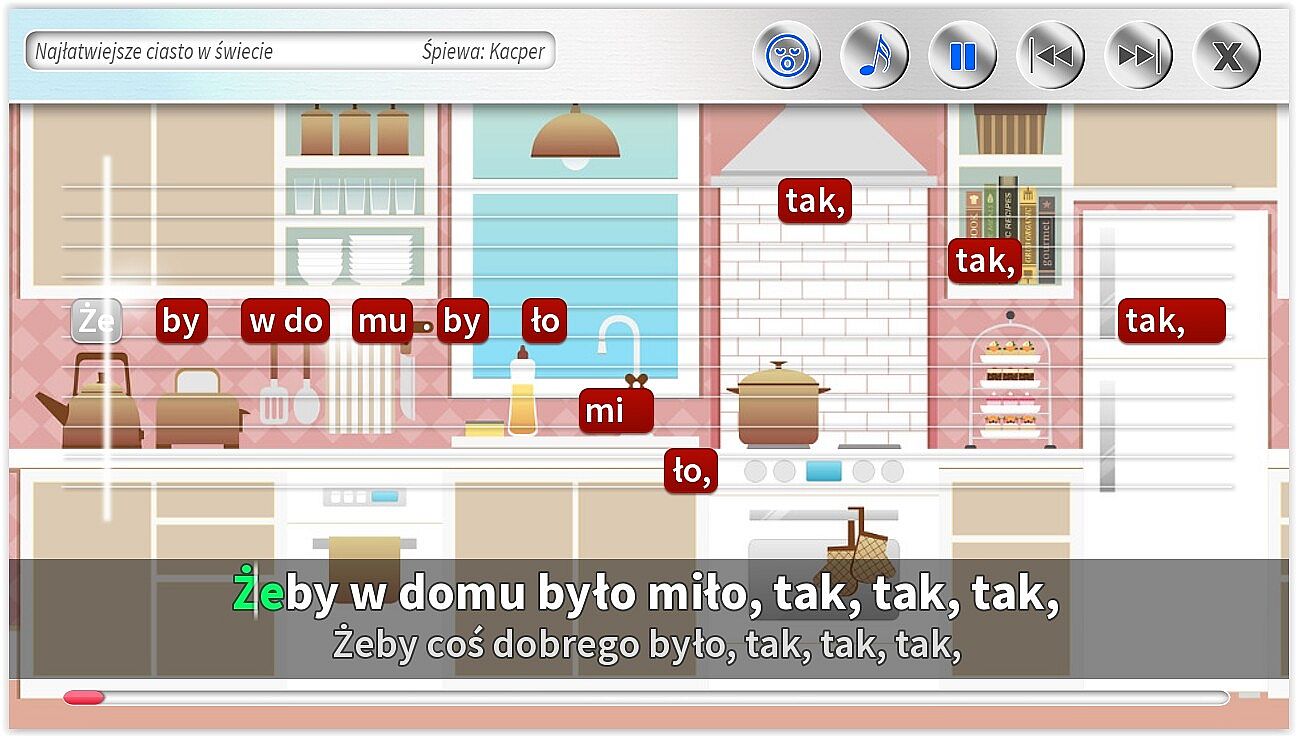 - Różne rodzaje podpowiedzi na ekranie, w tym: tekst piosenki, belki z tekstem, pasek czasu.
